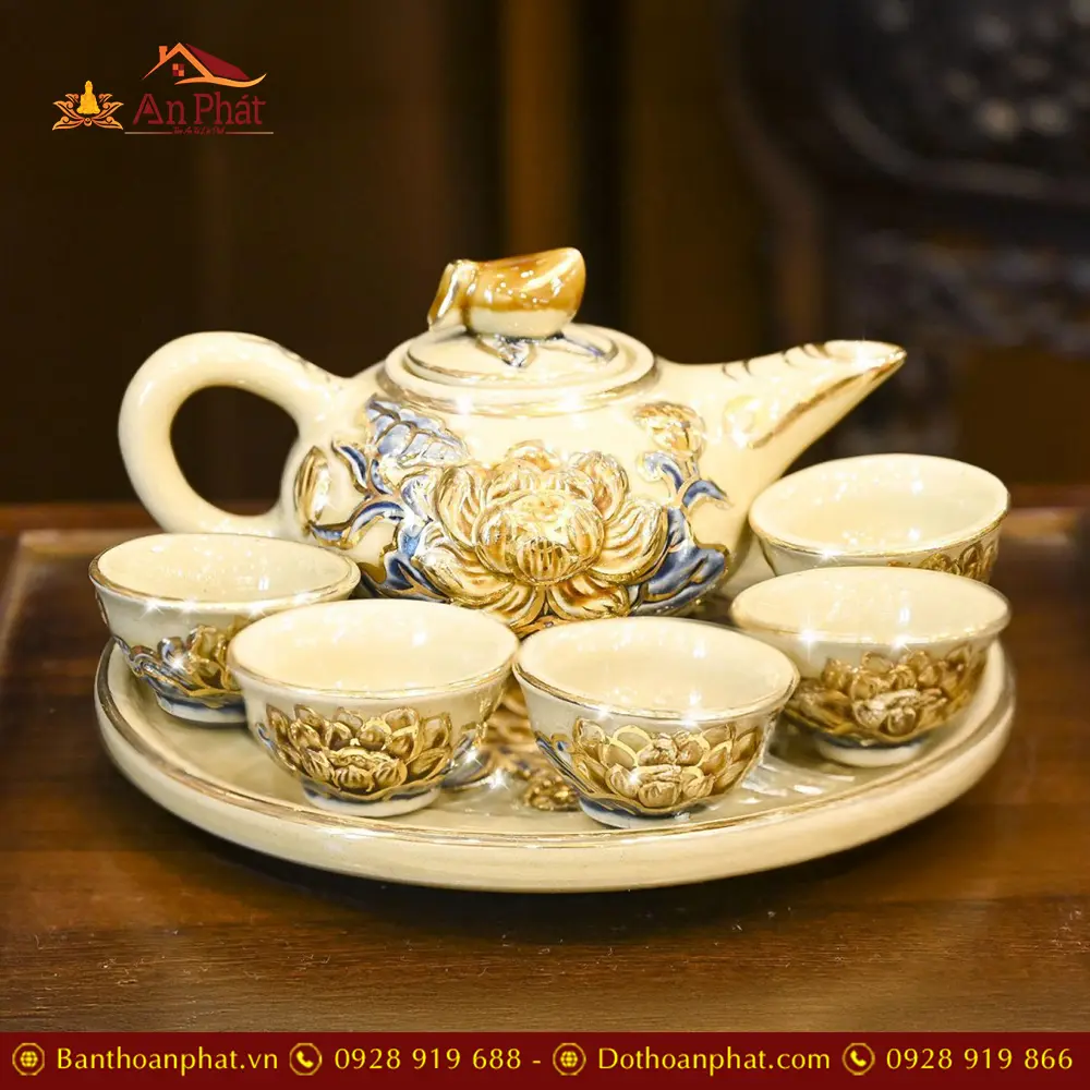 Bộ Ấm Chén Trà Thờ Men Hoàng Thổ Đắp Nổi Vẽ Vàng DT848