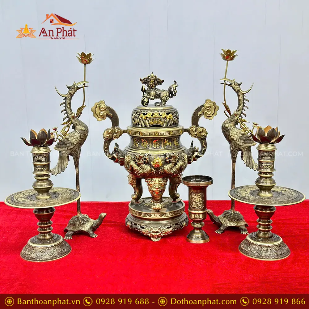 Bộ Đỉnh Hạc Bằng Đồng Cao Cấp Kèm Chân Nến Đôi Mẫu Cuốn Thư Hạc Cánh Tiên To DT1086