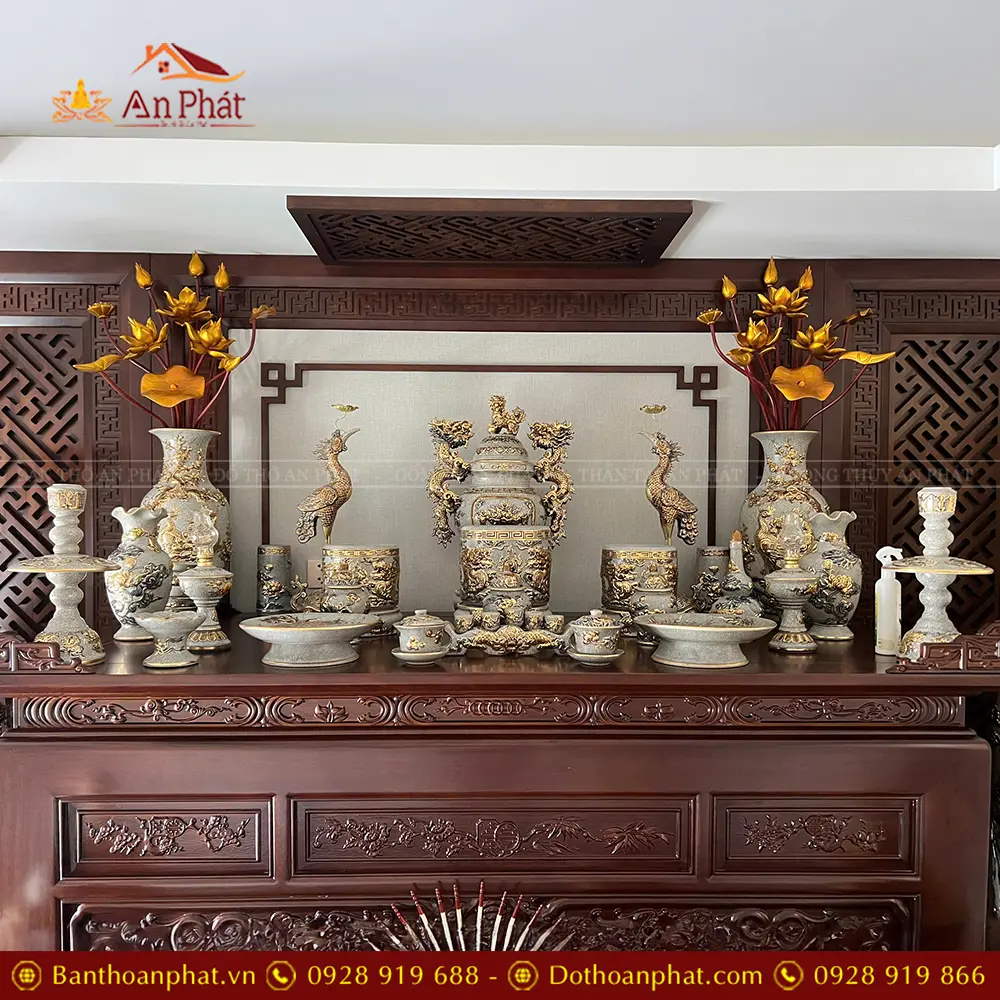 Bộ Đồ Thờ Gốm Sứ Bát Tràng Vẽ Vàng Cao Cấp Men Rạn Đắp Nổi NDT178