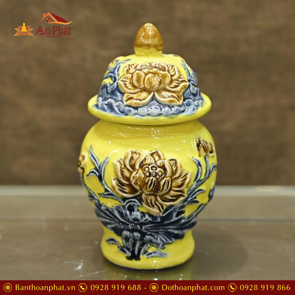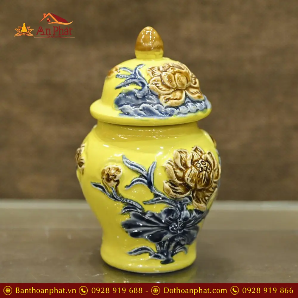 Choé Thờ Đắp Nổi Hoa Sen Gốm Vàng Sứ Bát Tràng DT754