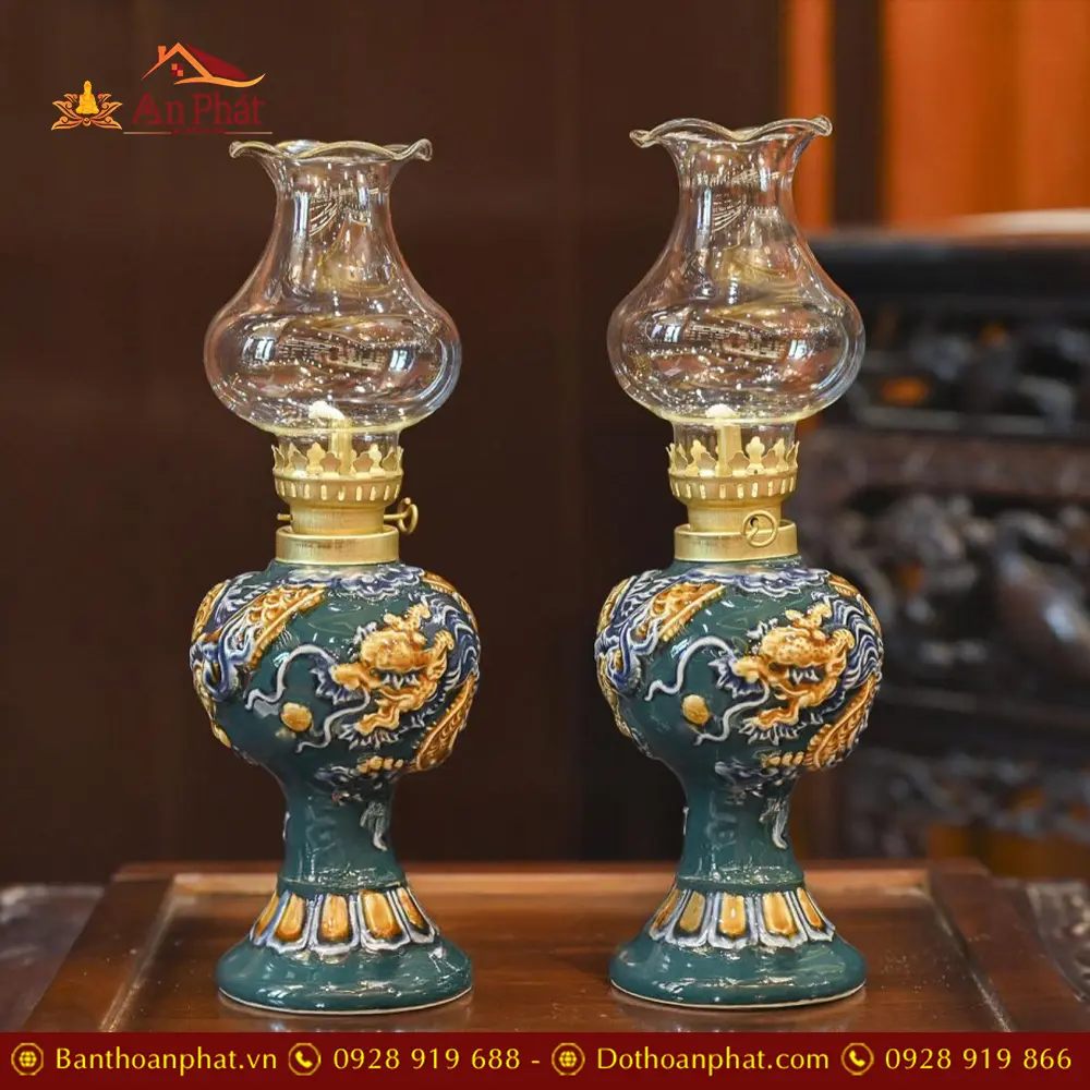 Đèn Dầu Sứ Bát Tràng Men Màu Xanh Đắp Nổi Rồng DT771