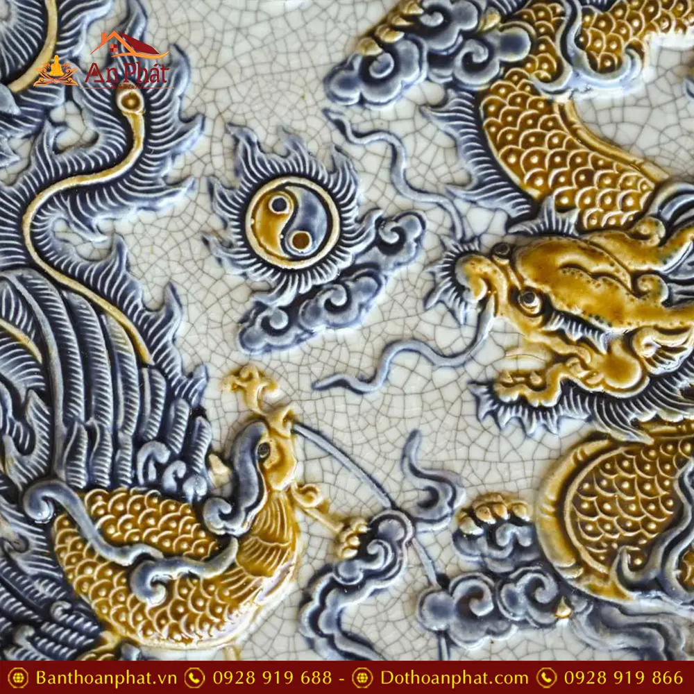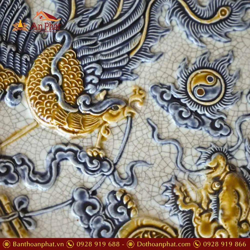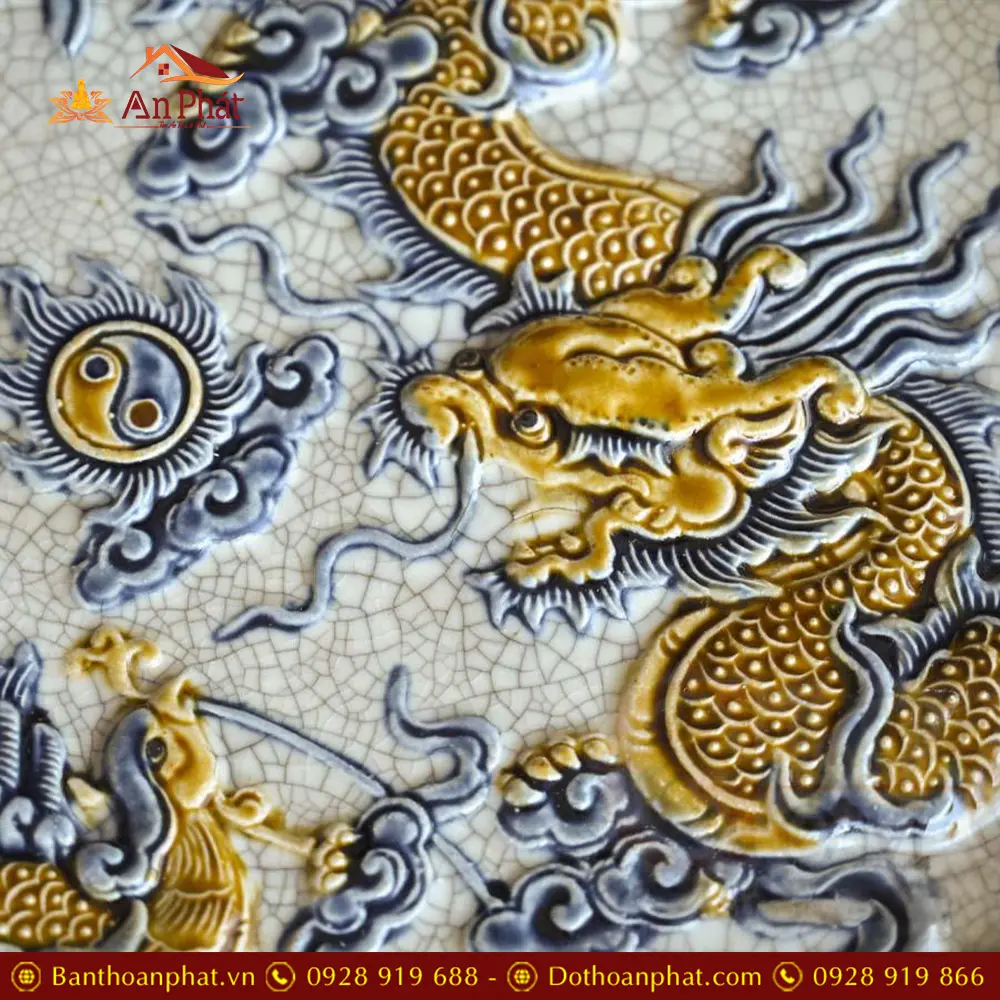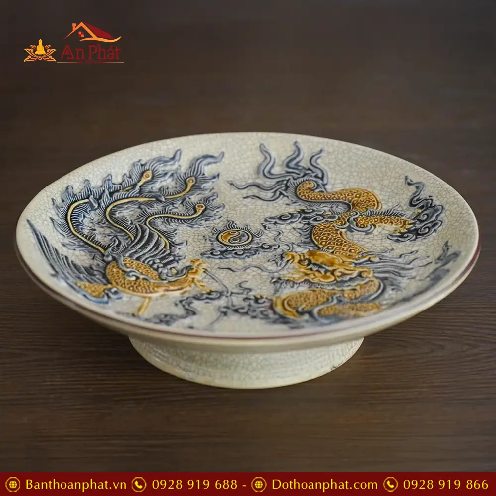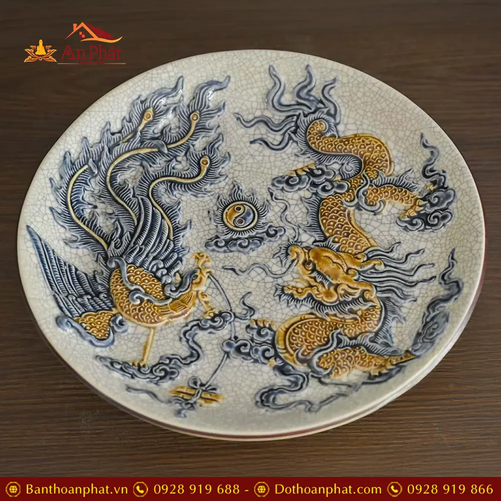 Đĩa Thờ Bát Tràng Men Rạn Đắp Nổi Long Phụng Chầu Nguyệt DT705