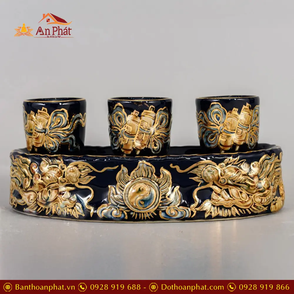 Kỷ Chén Cong Đắp Nổi Xanh CoBan Vẽ Vàng Cao Cấp DT804