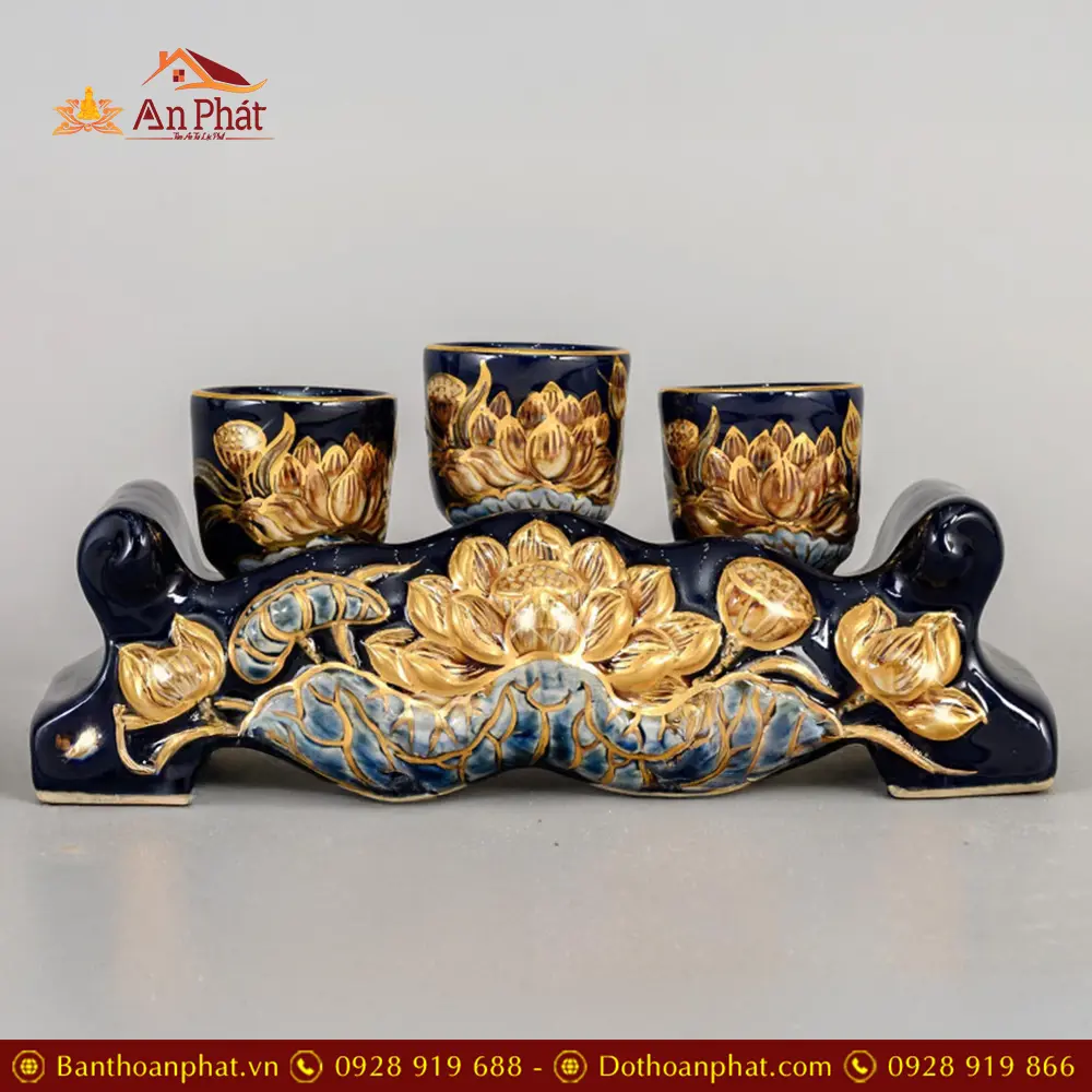 Kỷ Chén Ngai Bát Tràng Xanh Coban Đắp Nổi Vẽ Vàng DT805