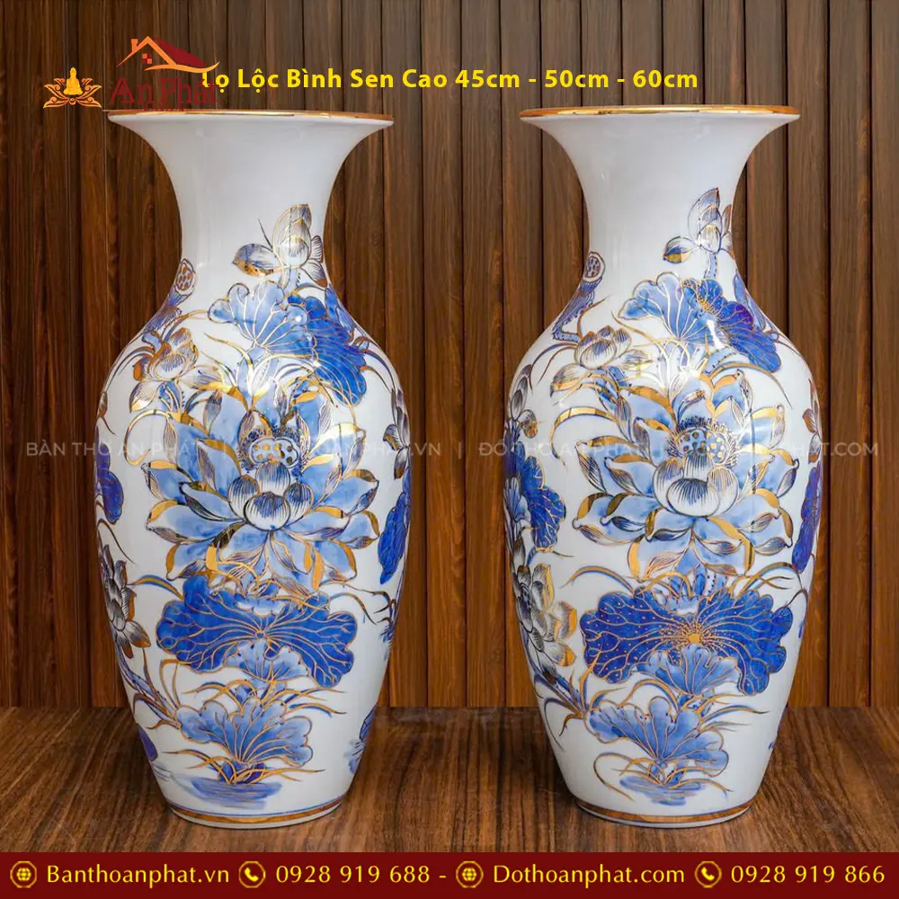 Lọ Hoa Dáng Lộc Bình Men Lam Vẽ Vàng Hoa Sen Cao Cấp DT1071