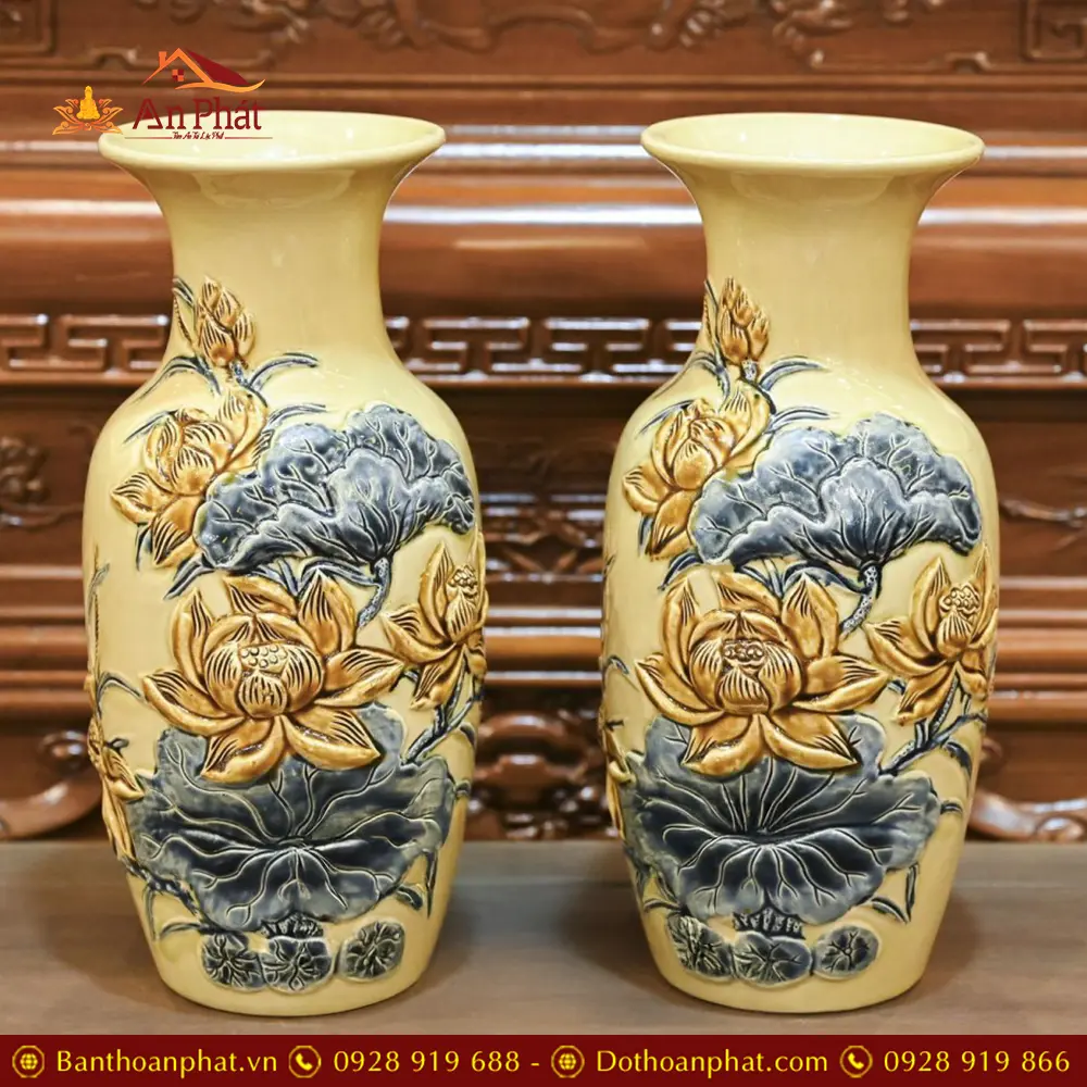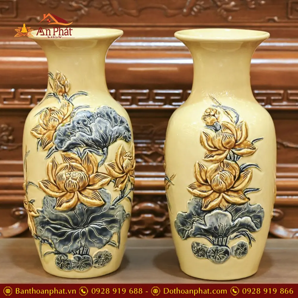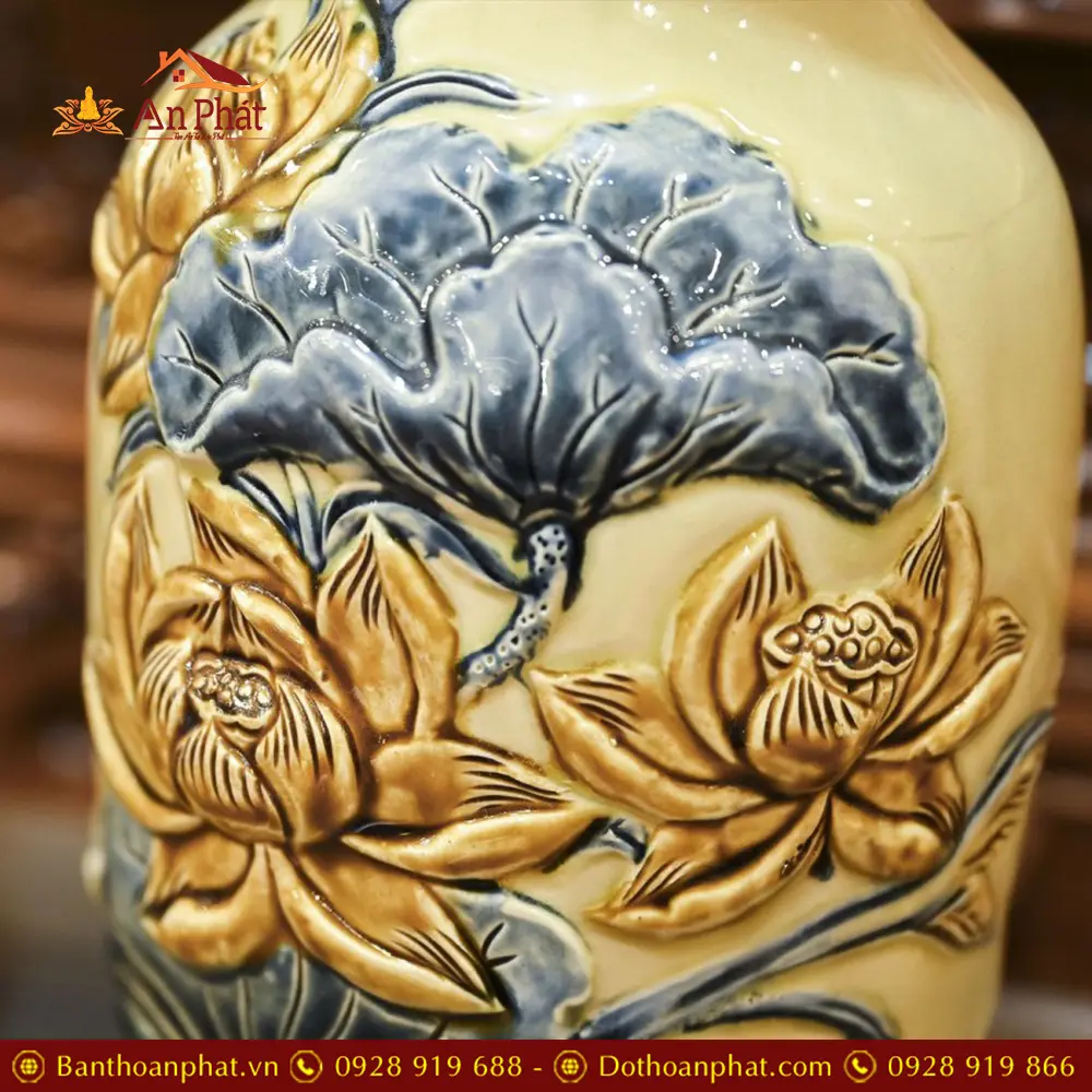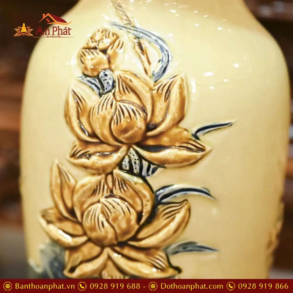 Lộc Bình Sứ Bát Tràng Men Hoàng Thổ Đắp Nổi Hoa Sen DT726