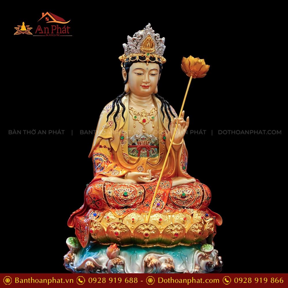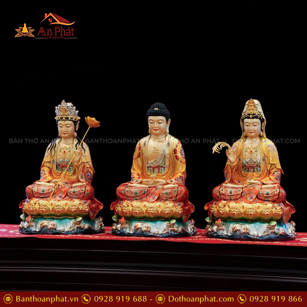 Tôn Tượng Tây Phương Tam Thánh Ngọc Thạch Phủ Đồng Tọa Lá Sen Vẽ gấm Đỏ cam T2394