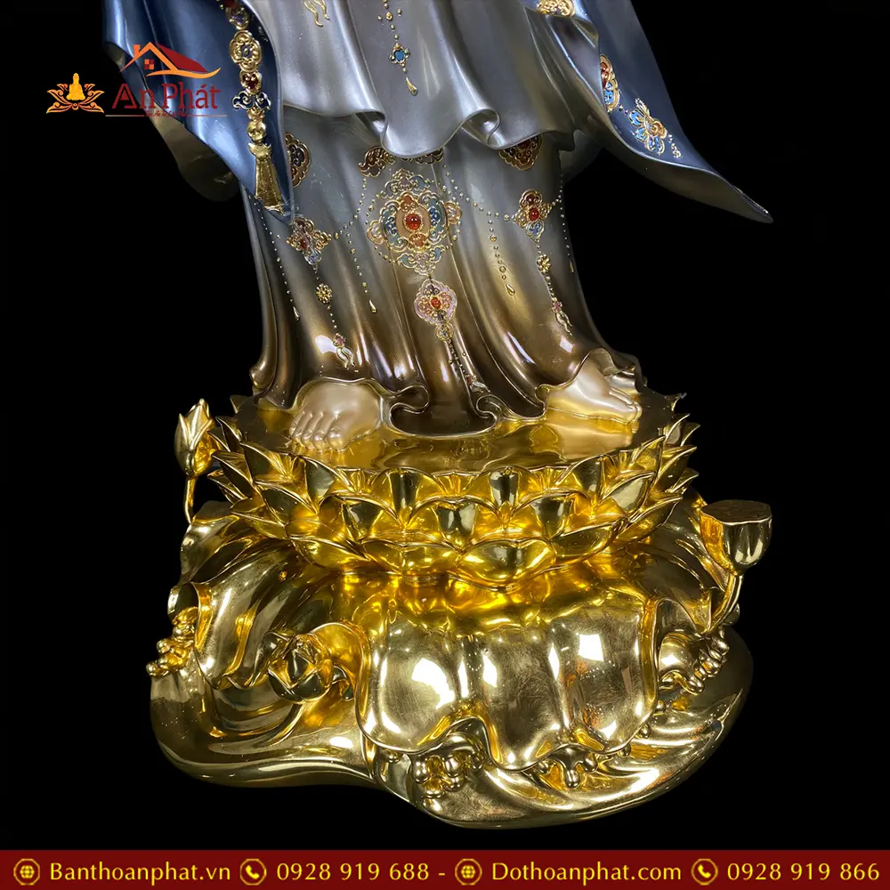 Tượng Quan Âm Bồ Tát Đứng Đế Non Nước Có Lá Đề Cao Cấp T2579