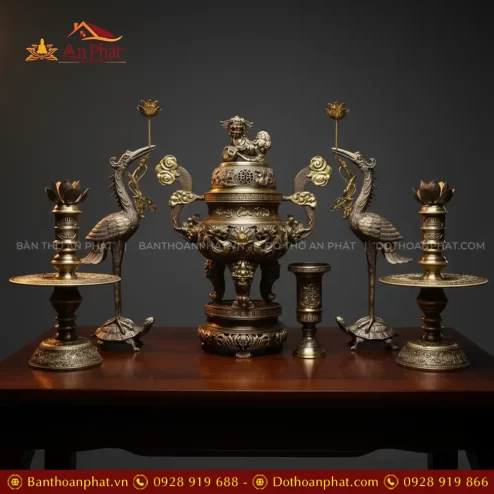 Bộ Đỉnh Hạc Bằng Đồng Cao Cấp Kèm Chân Nến Đôi Mẫu Cuốn Thư Hạc Cánh Tiên To DT1086