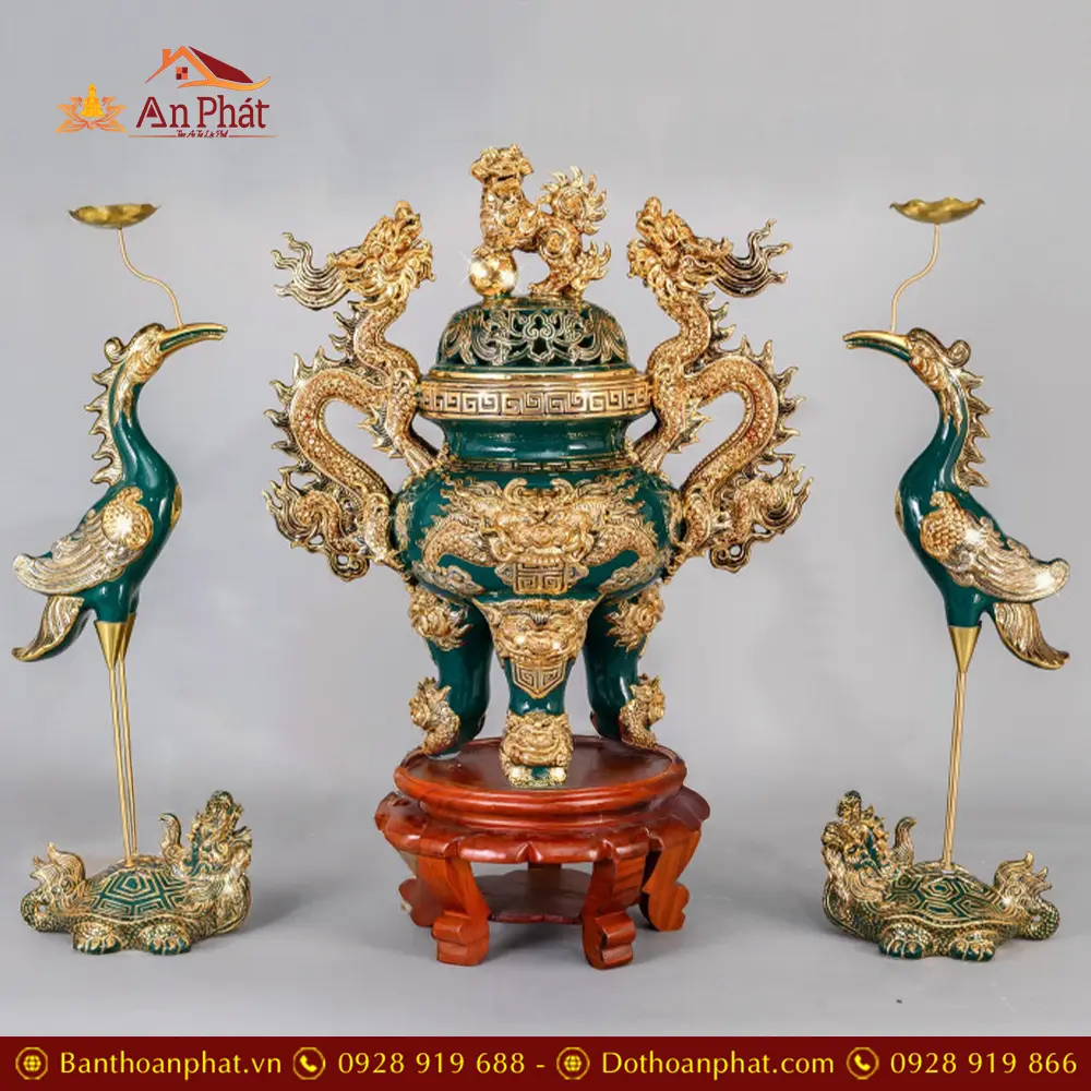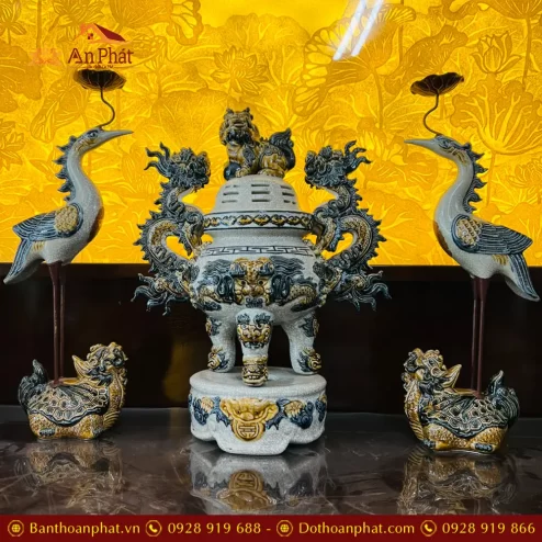 Bộ Đỉnh Hạc Gốm Sứ Bát Tràng Men Màu Xanh Đắp Nổi Vẽ Vàng DT908