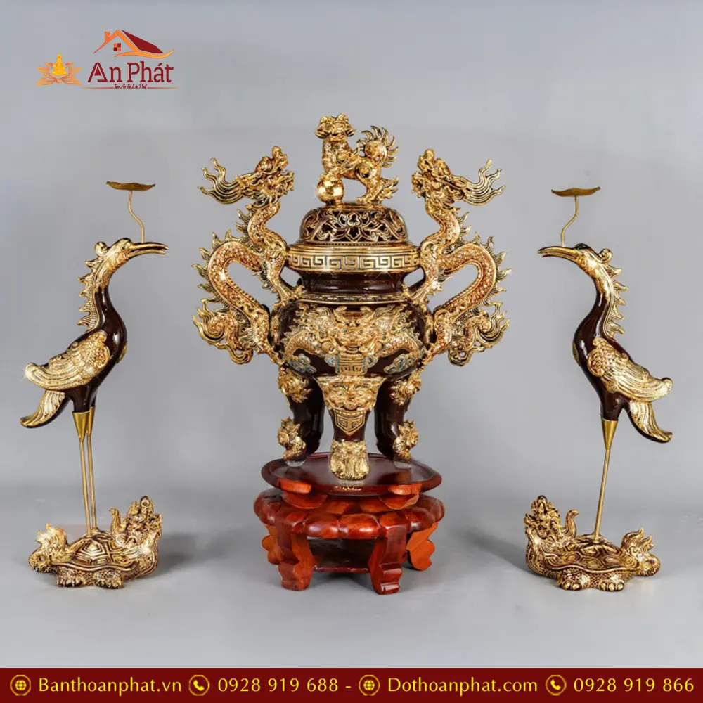 Bộ Tam Sự Đỉnh Hạc Màu Nâu Đắp Nổi Vẽ Vàng Cao Cấp DT910