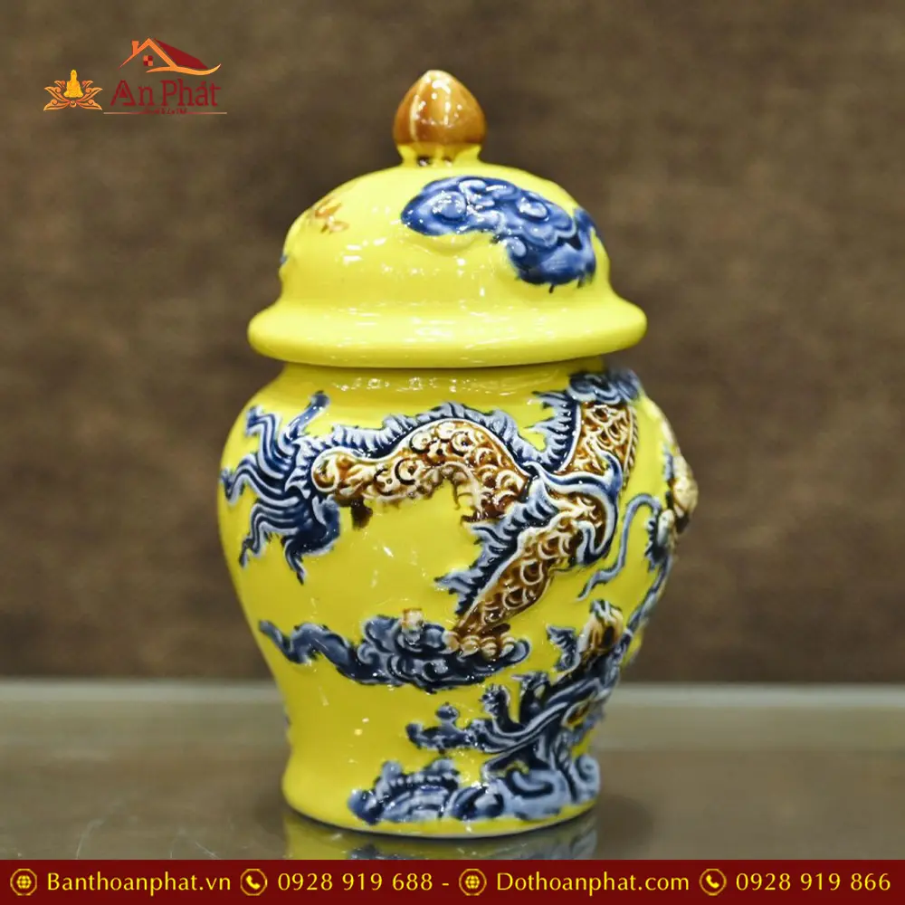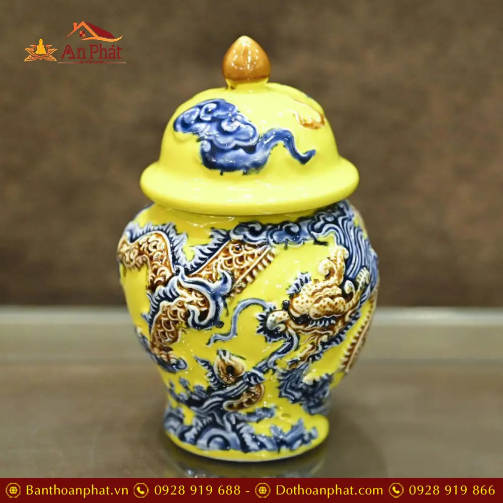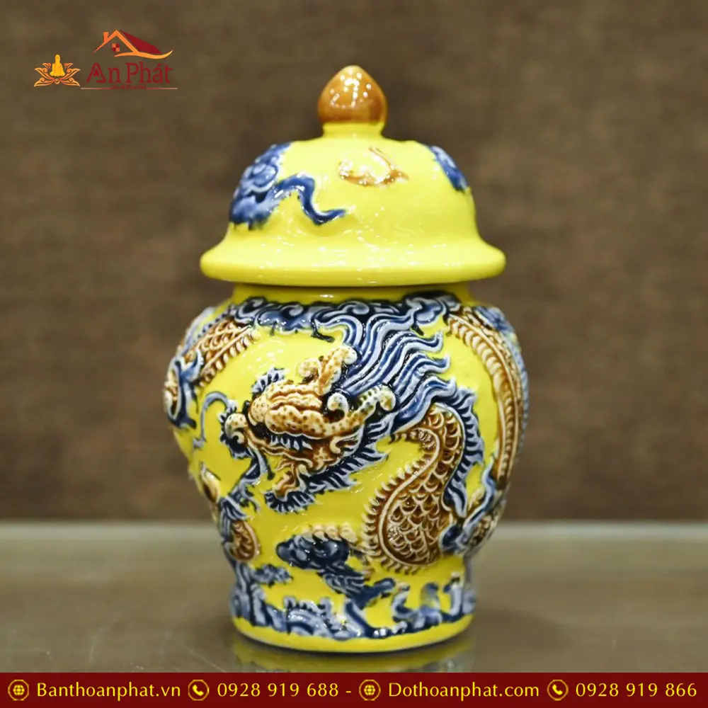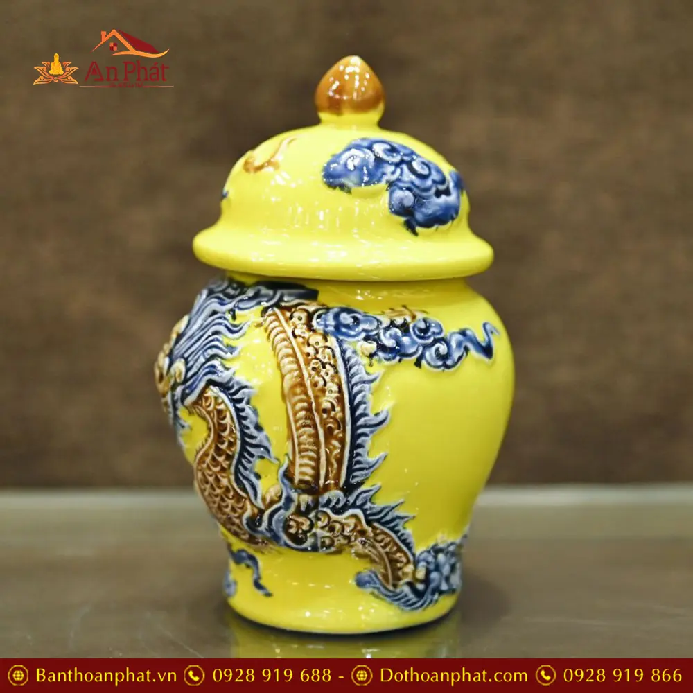 Choé Thờ Bát Tràng Gốm Vàng Đắp Nổi Rồng DT755
