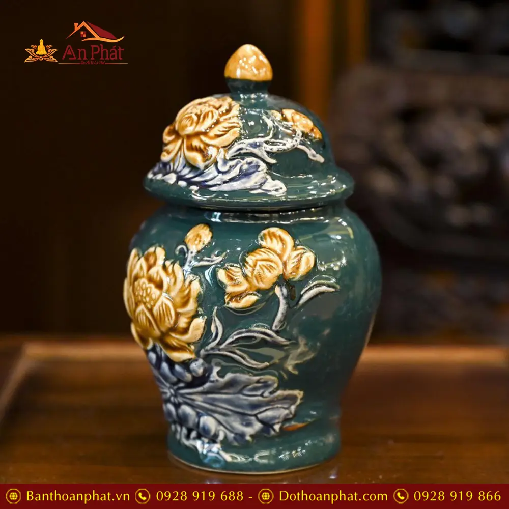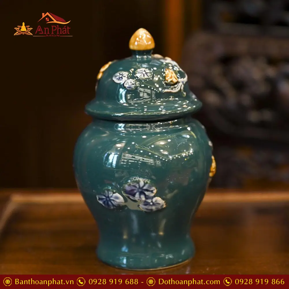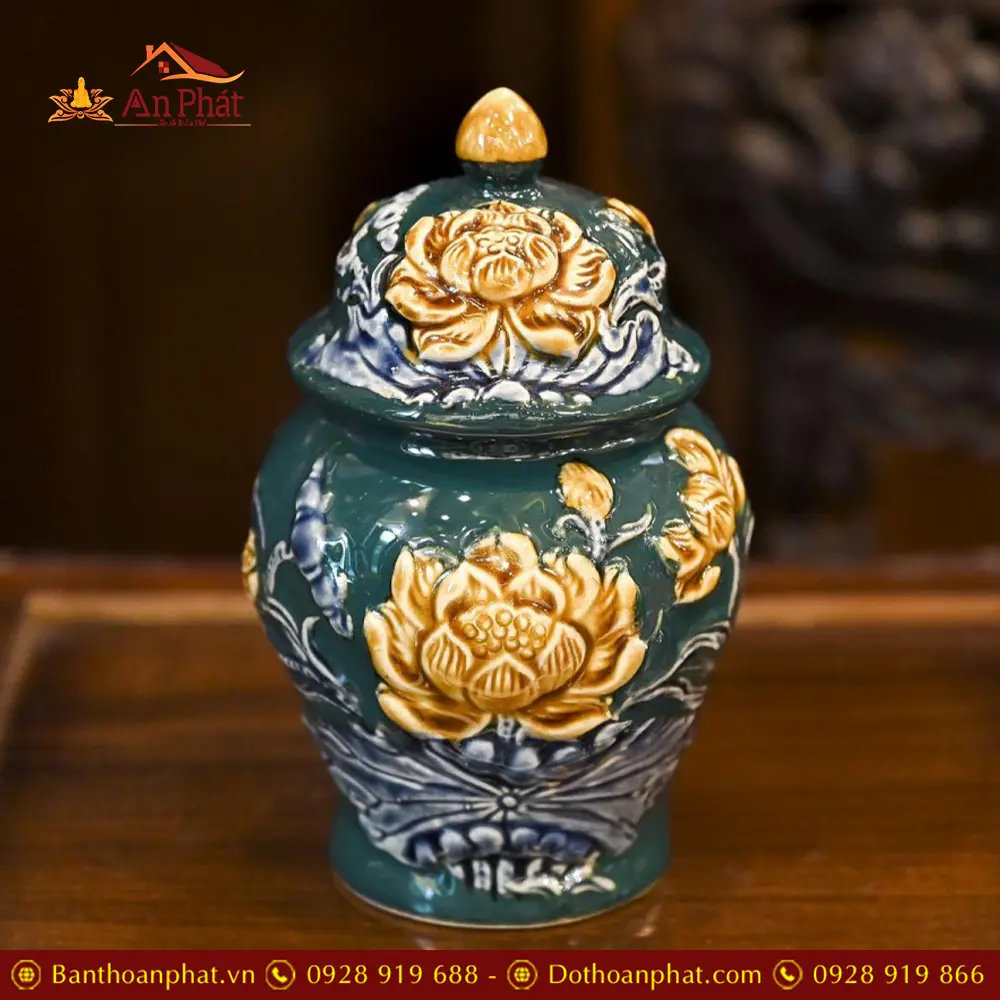 Choé Thờ Men Màu Xanh Đắp Nổi Hoa Sen Bát Tràng DT756