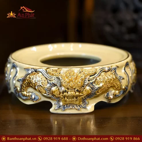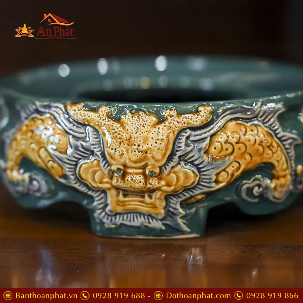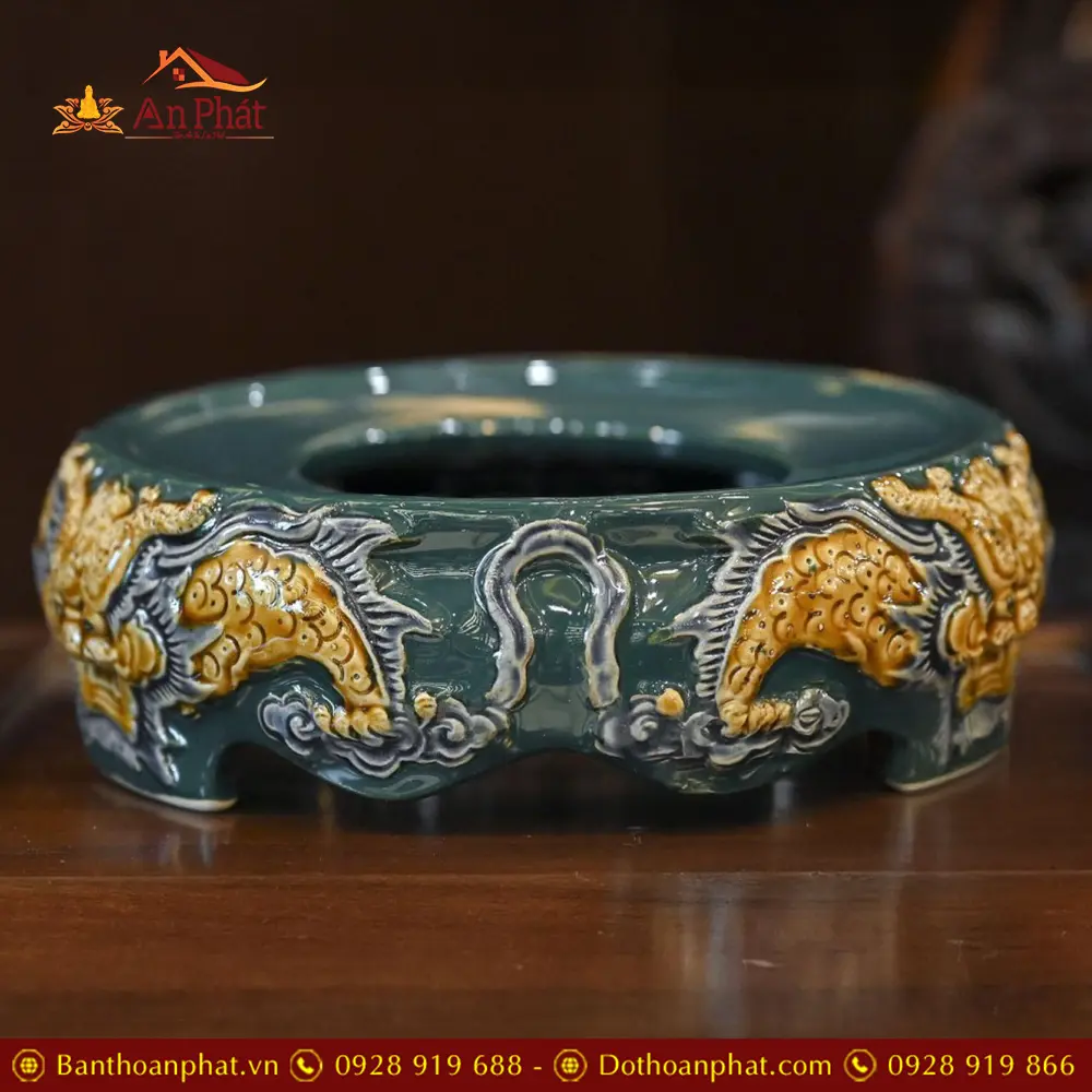 Đế Bát Hương Bát Tràng Men Xanh Rồng Đắp Nổi DT681