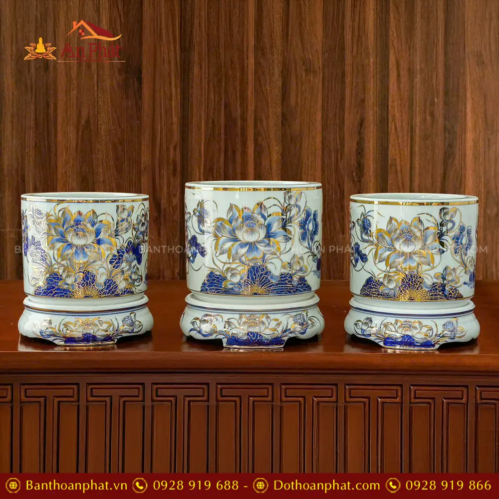 Đế Bát Hương Mẫu Hoa Sen Men Lam Vẽ Vàng Cao Cấp DT1050