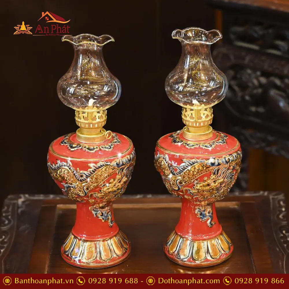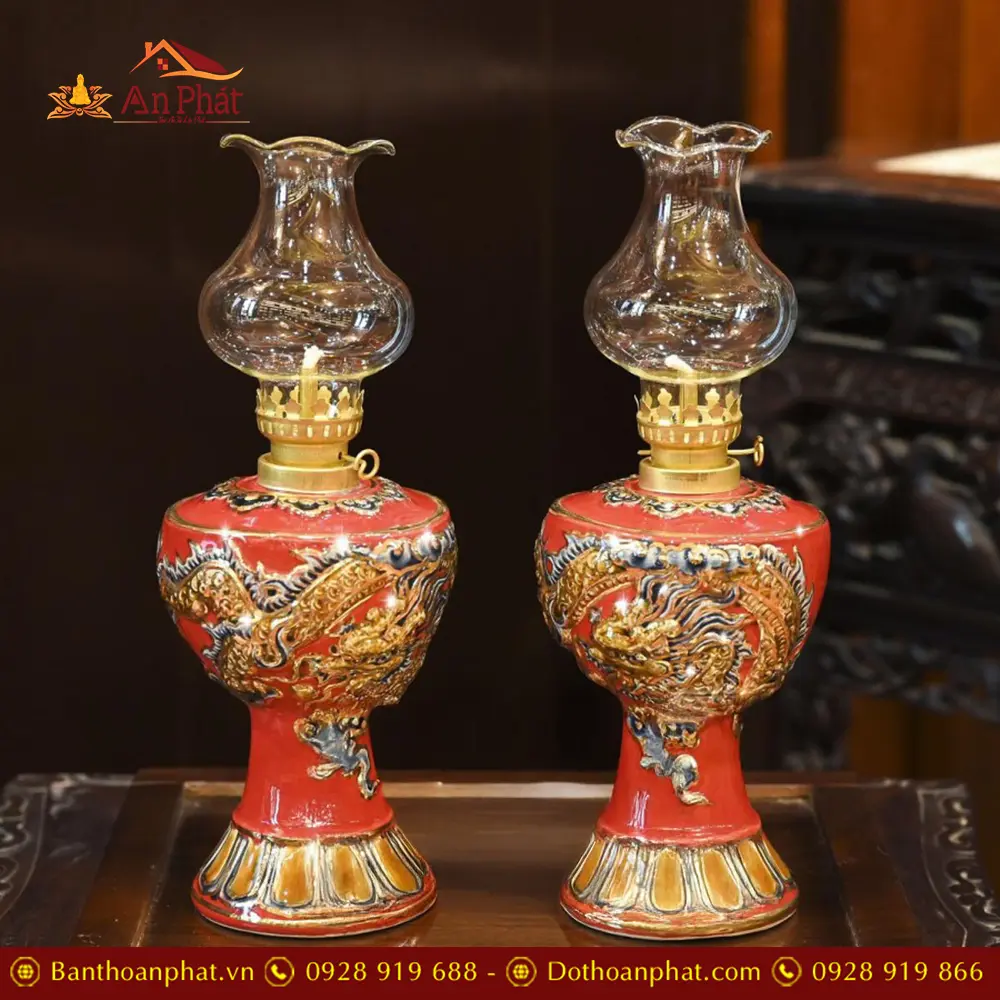 Đèn Thờ Dầu Men Màu Đỏ Đắp Nổi Rồng Vẽ Vàng DT776
