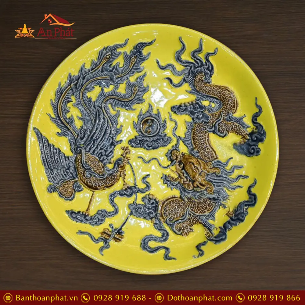 Đĩa Bồng Thờ Men Vàng Đắp Nổi Bát Tràng Rồng Phụng DT701