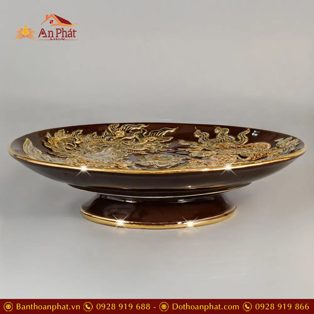 Đĩa Thờ Bát Tràng Long Phụng Chầu Nguyệt Nâu Đắp Nổi Vẽ Vàng DT697