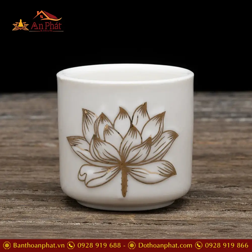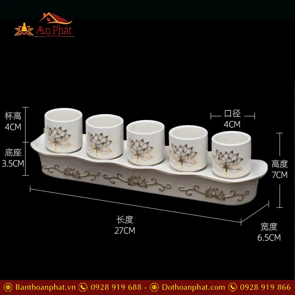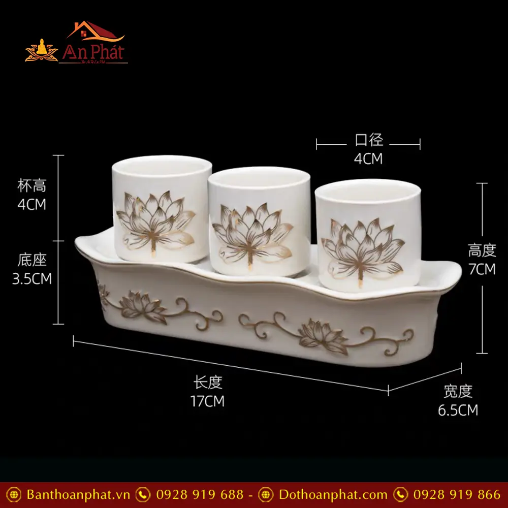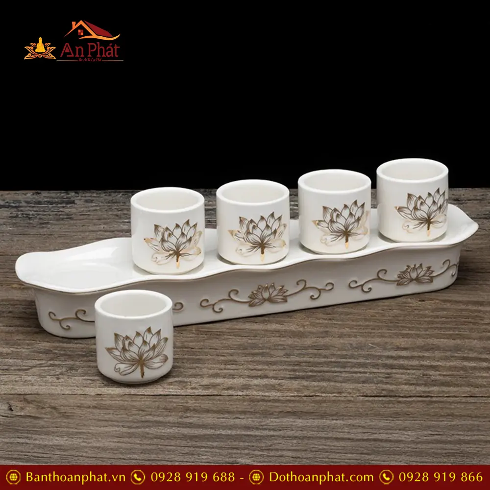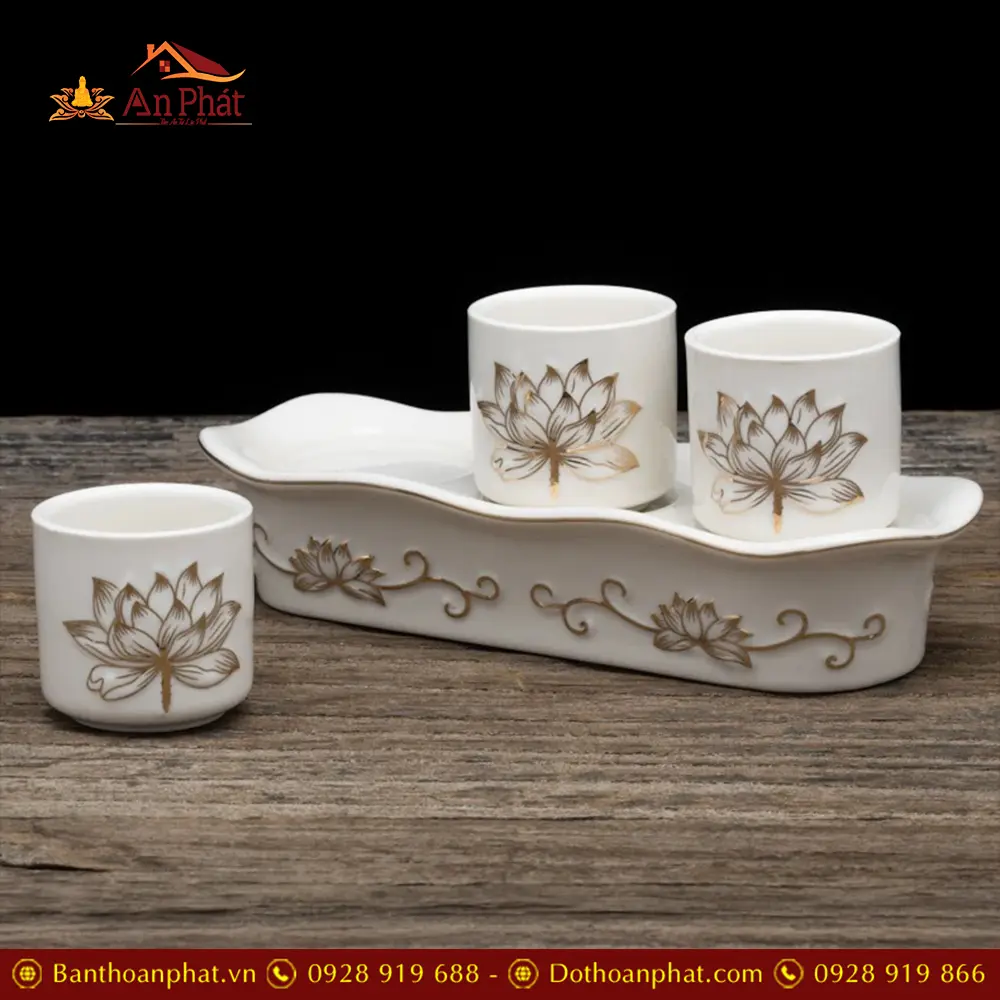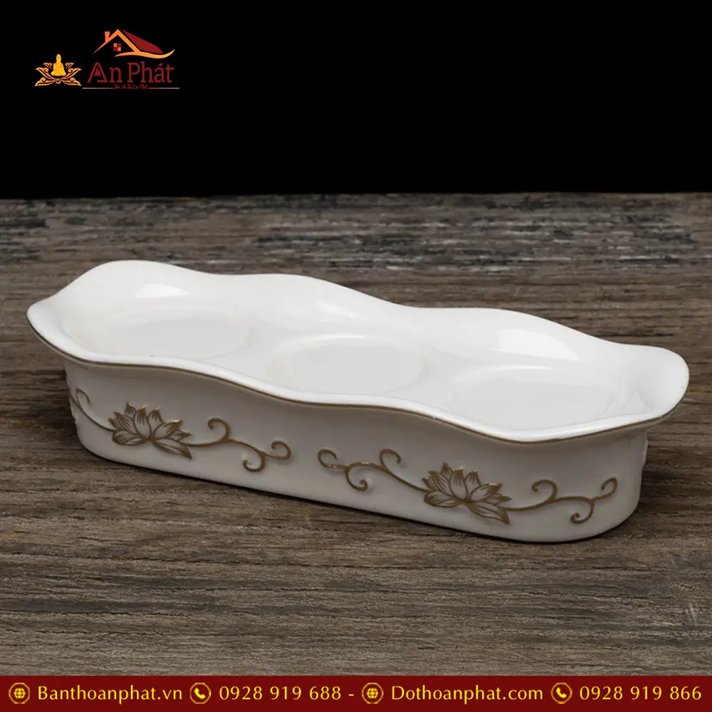 Khay Chén Nước Thờ Gốm Trắng Hoa Sen Viền Vàng DT627