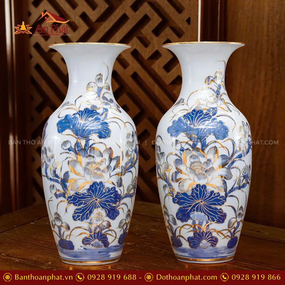 Lọ Hoa Dáng Lộc Bình Men Lam Vẽ Vàng Hoa Sen Cao Cấp DT1071