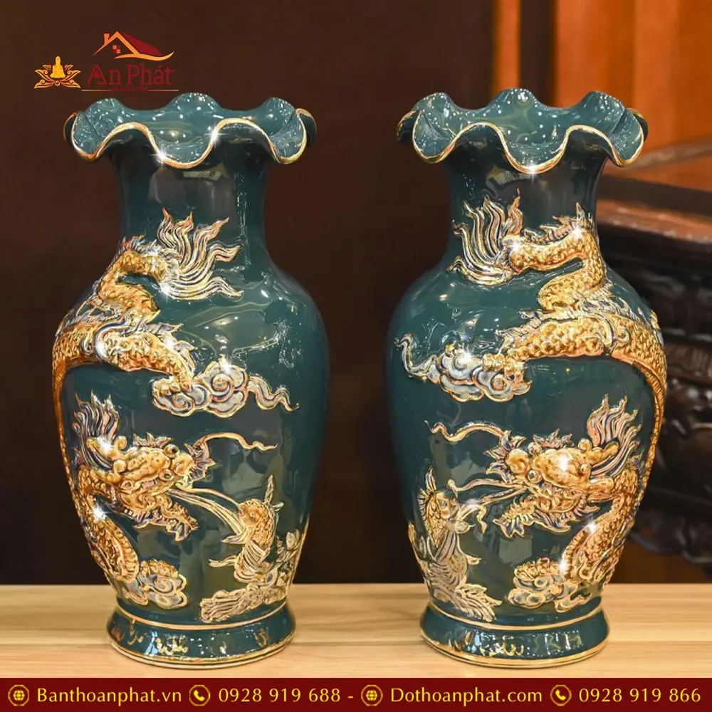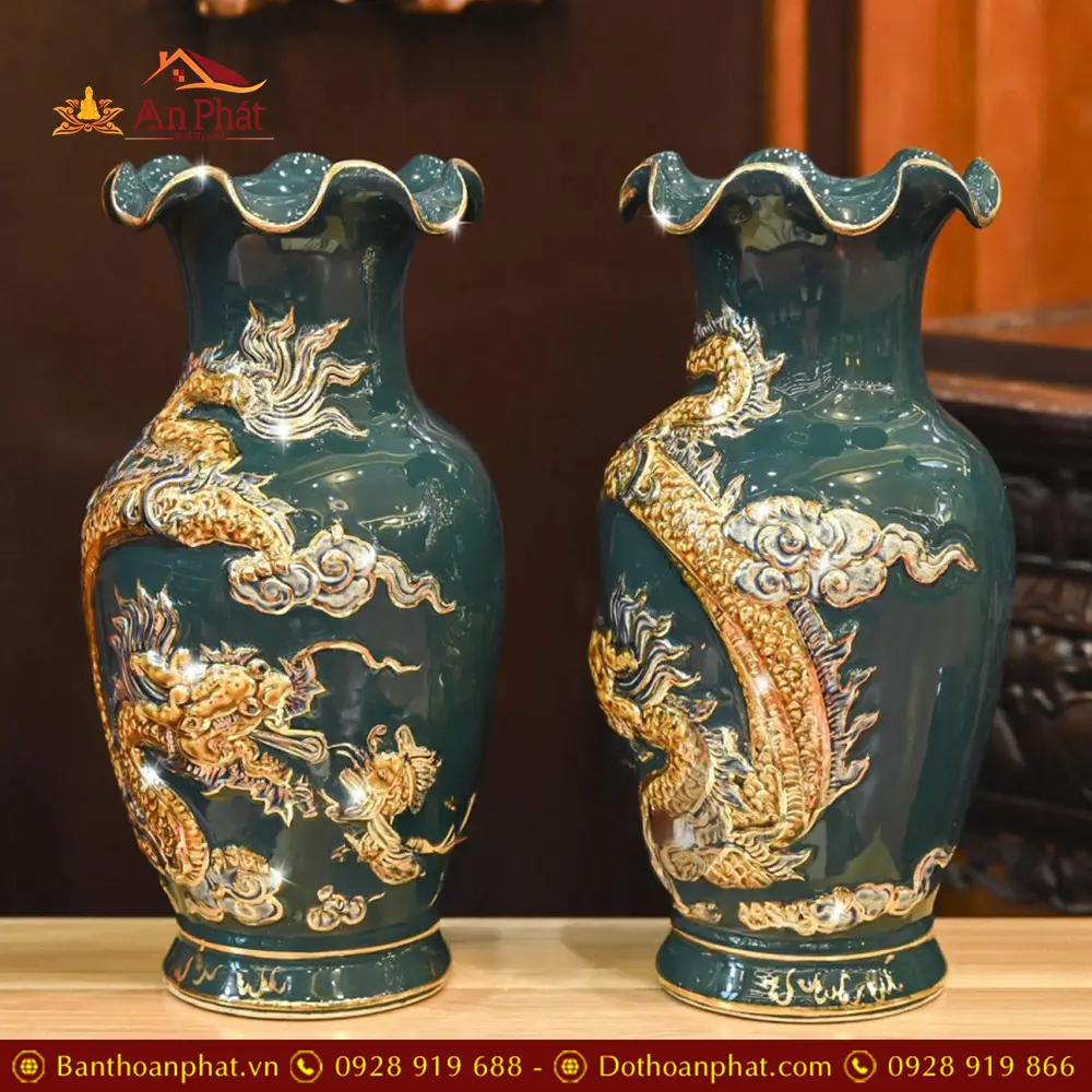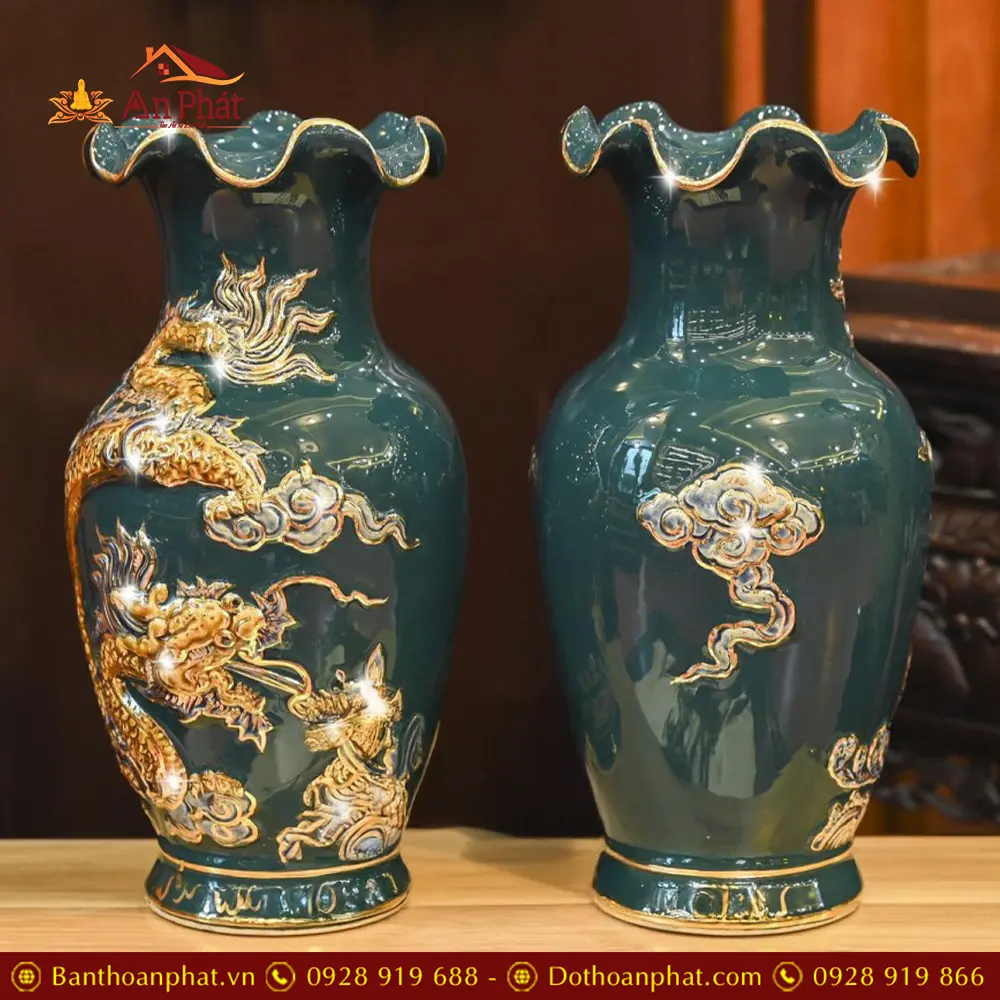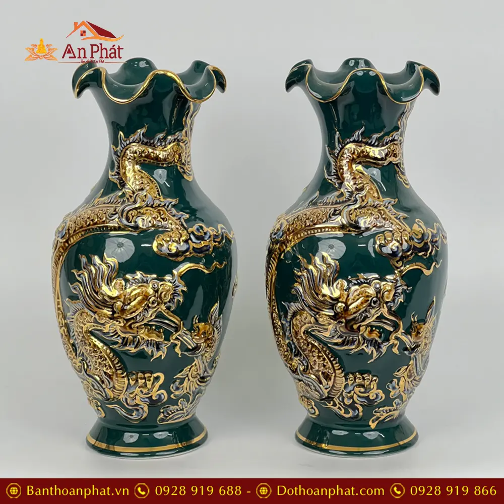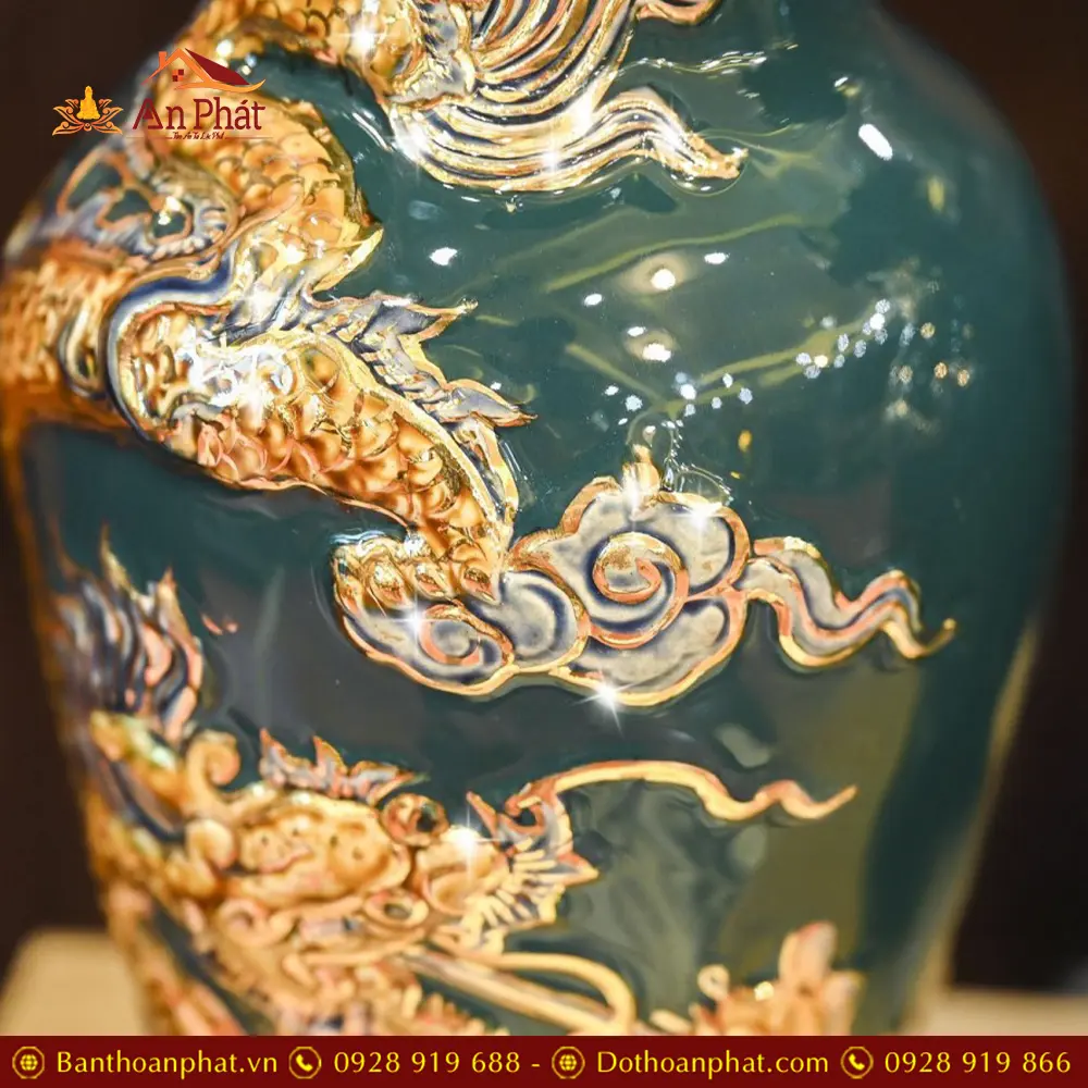 Lọ Hoa Đắp Nổi Rồng Xanh Vẽ Vàng Gốm Bát Tràng DT658