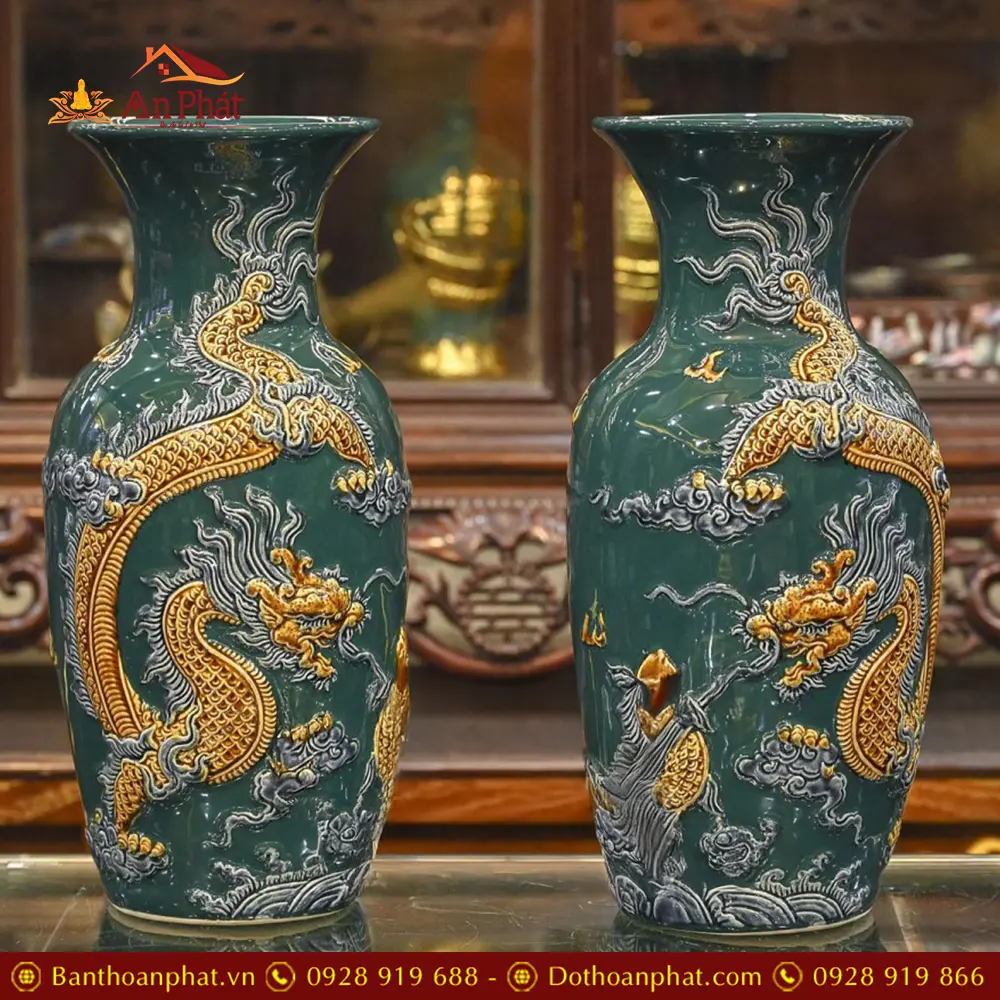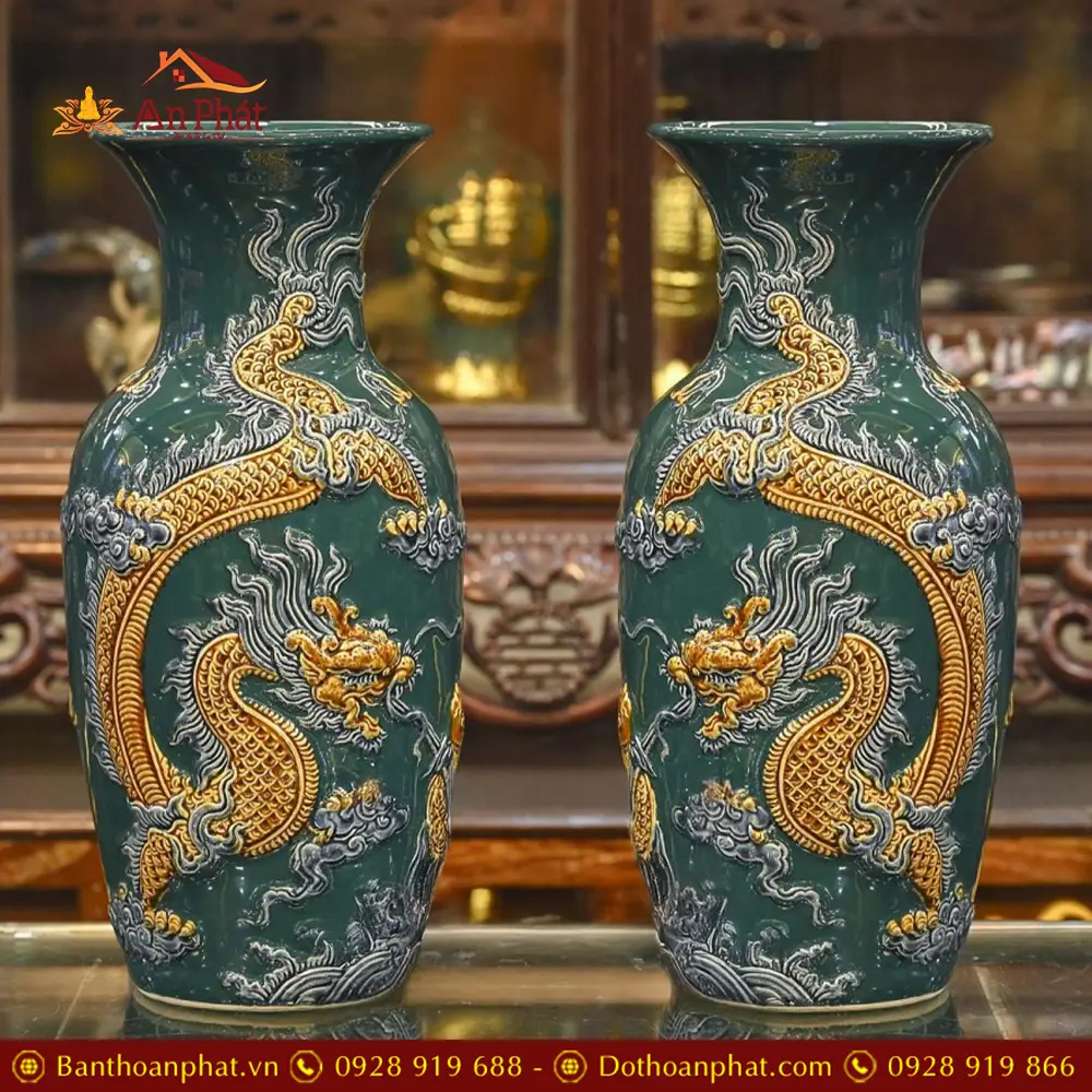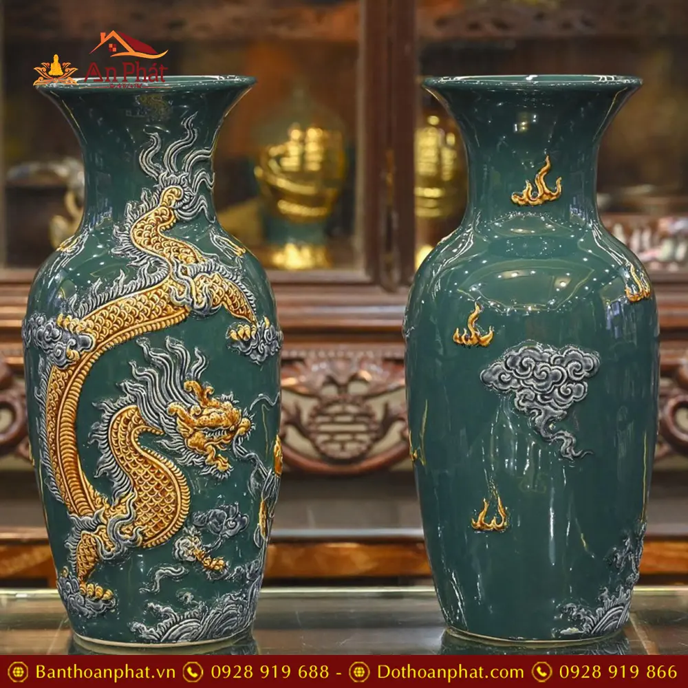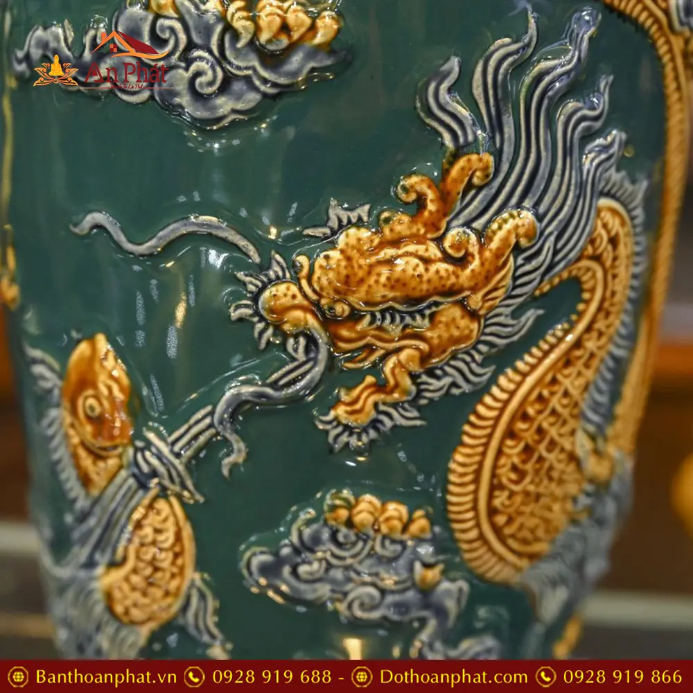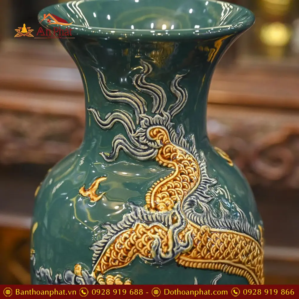 Lọ Lộc Bình Bát Tràng Men Xanh Đắp Nổi Rồng DT723