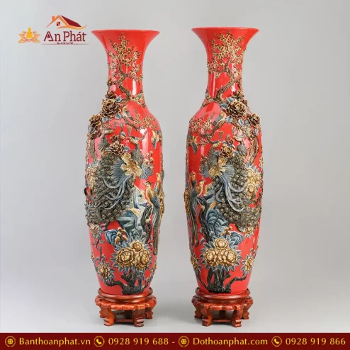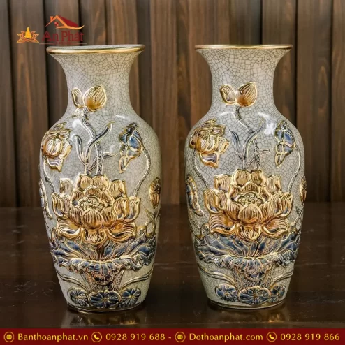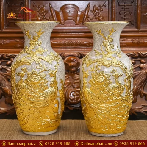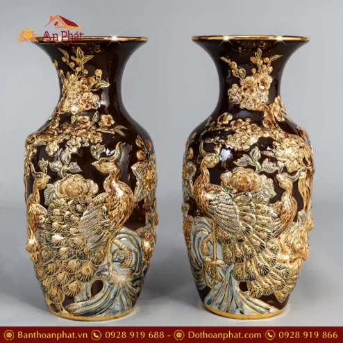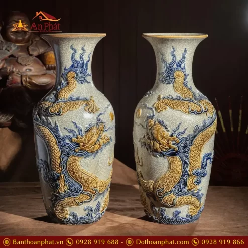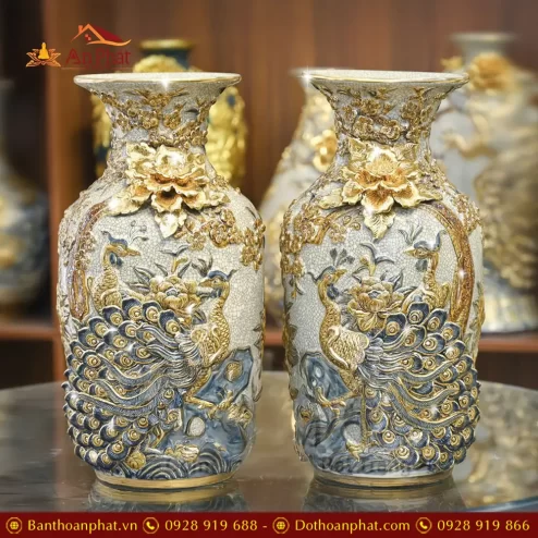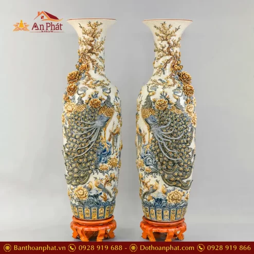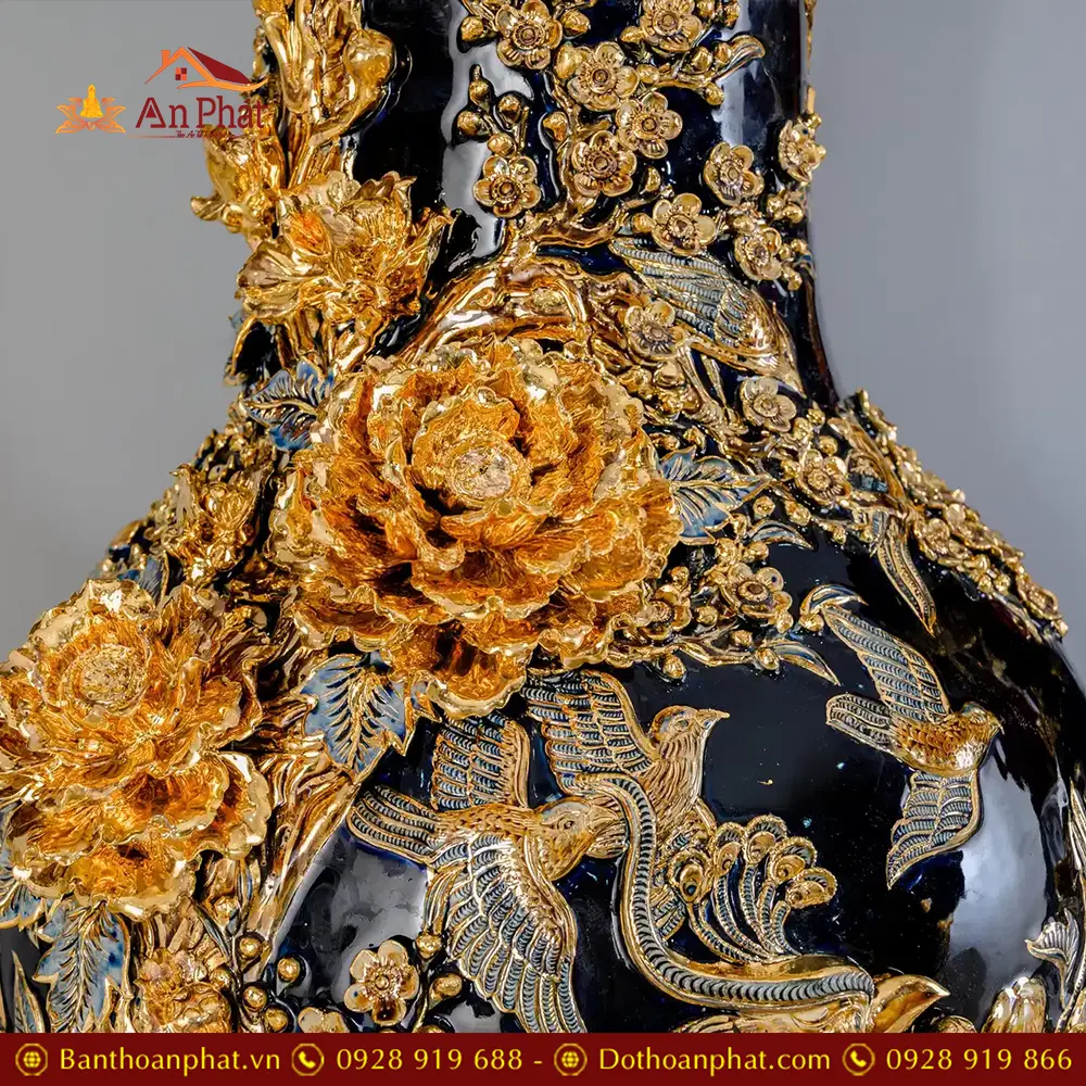 Lọ Lộc Bình Xanh Coban Đắp Nổi Công Đào Vẽ Vàng Cao Cấp DT962