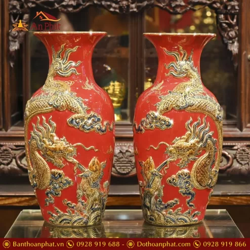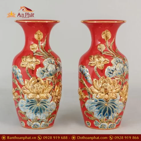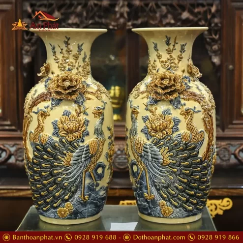 Lọ Lộc Bình Xanh Lục Bảo Đắp Nổi Tứ Cảnh Vẽ Vàng Cao Cấp DT958