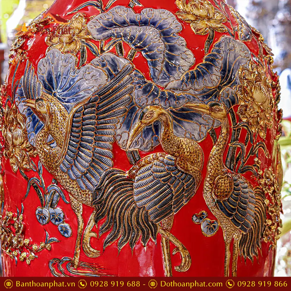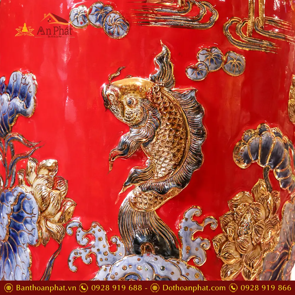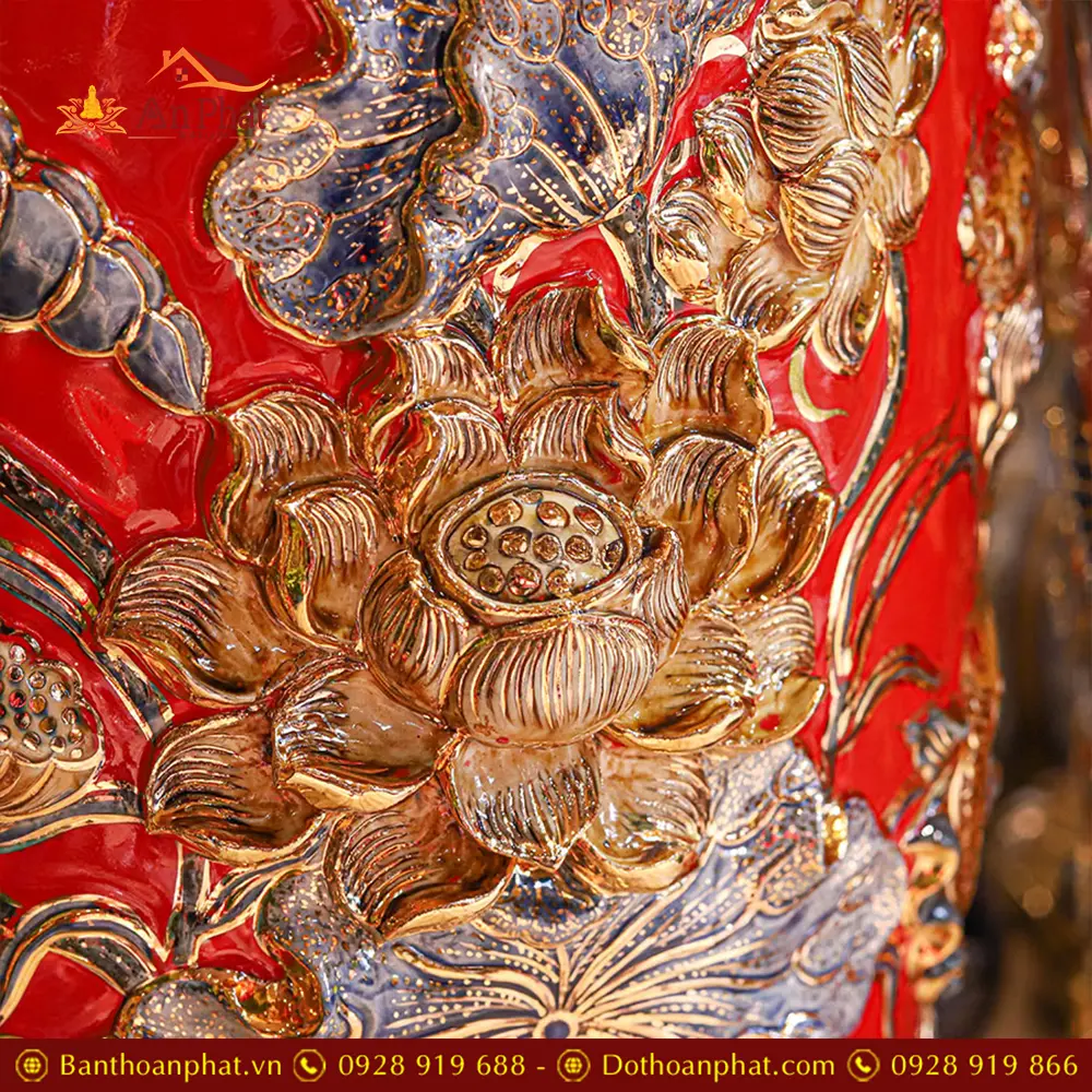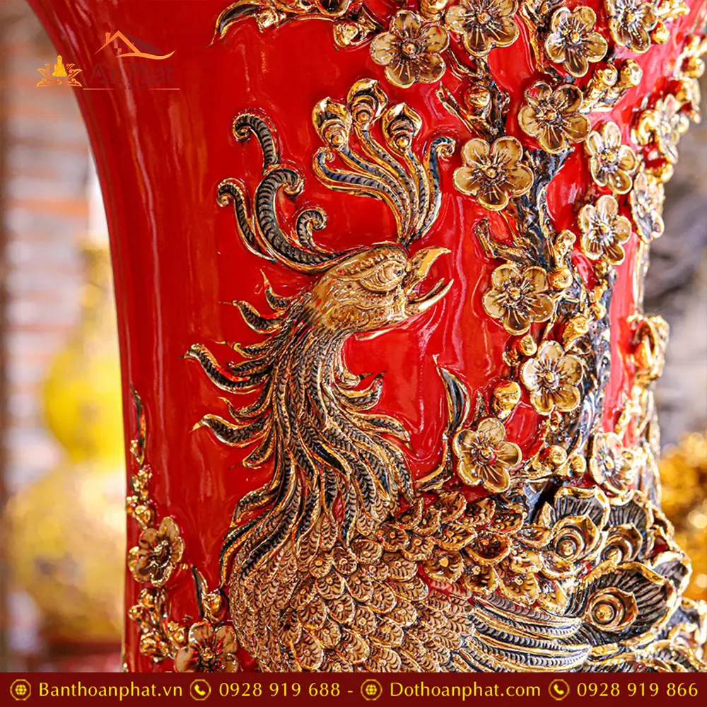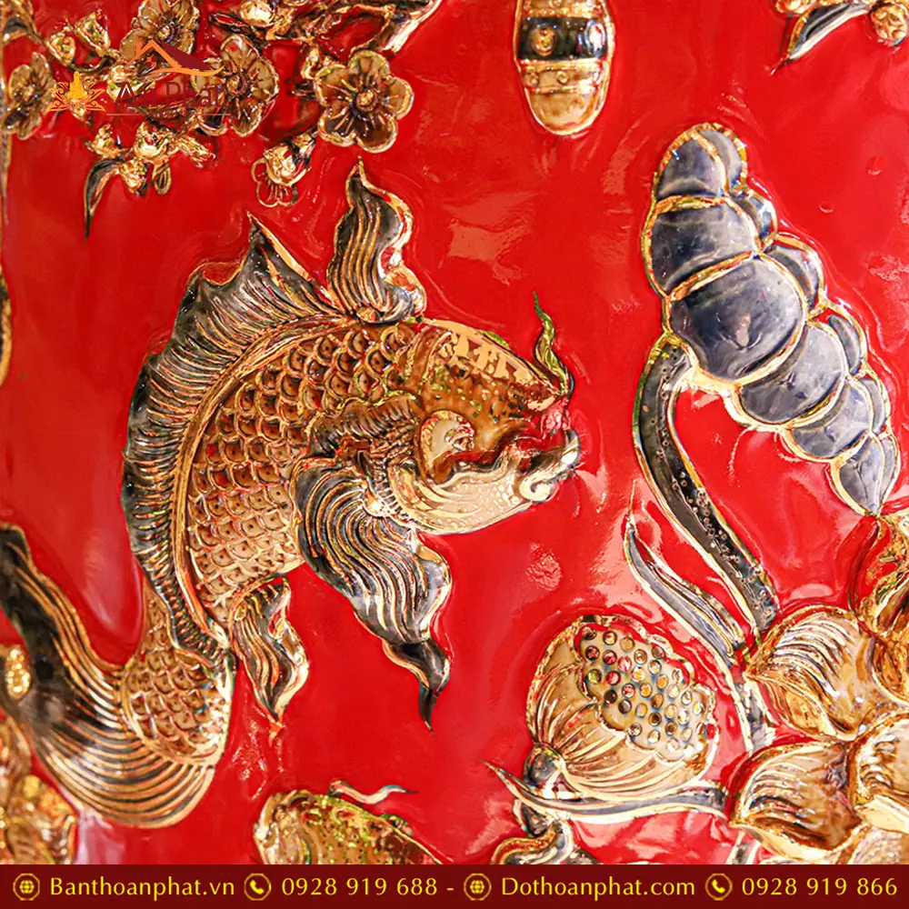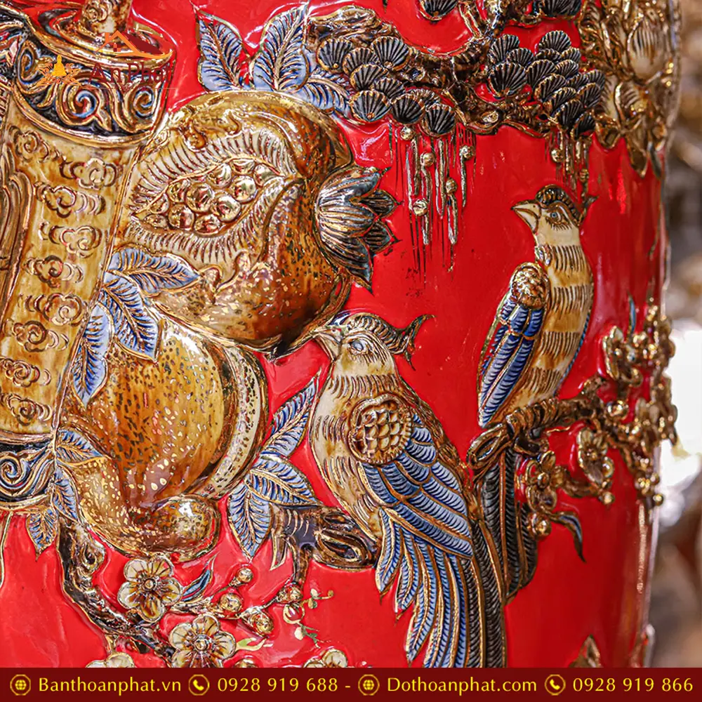 Lộc Bình Cao Cấp Phúc Đức Đắp Nổi Vẽ Vàng Men Màu Đỏ DT948