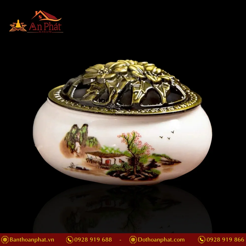 Lư Xông Trầm Gốm Vân Rạn Trắng Phong Cảnh PK9520 An Phát
