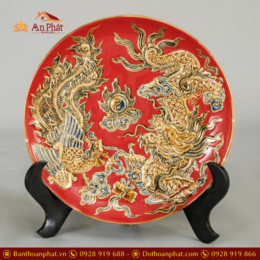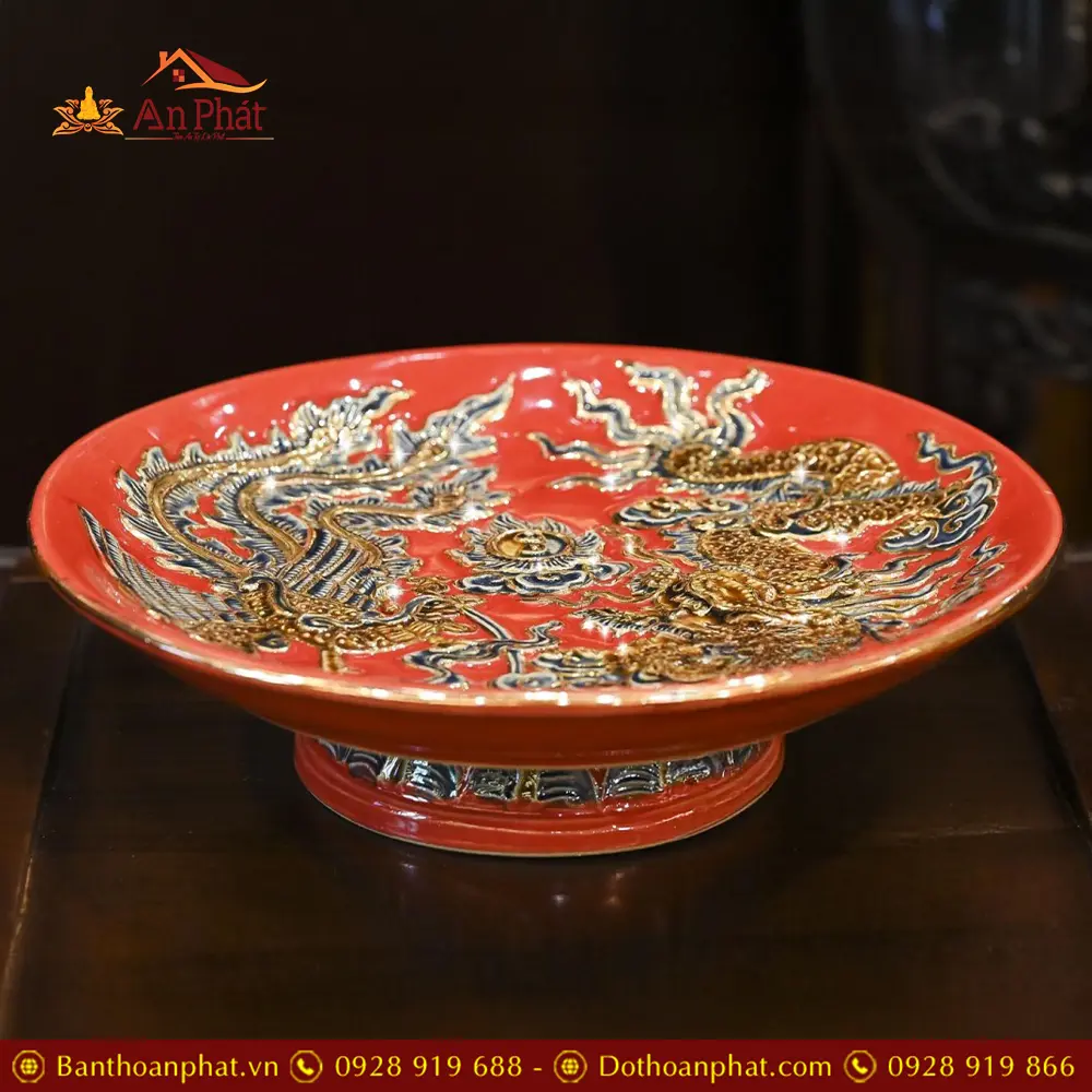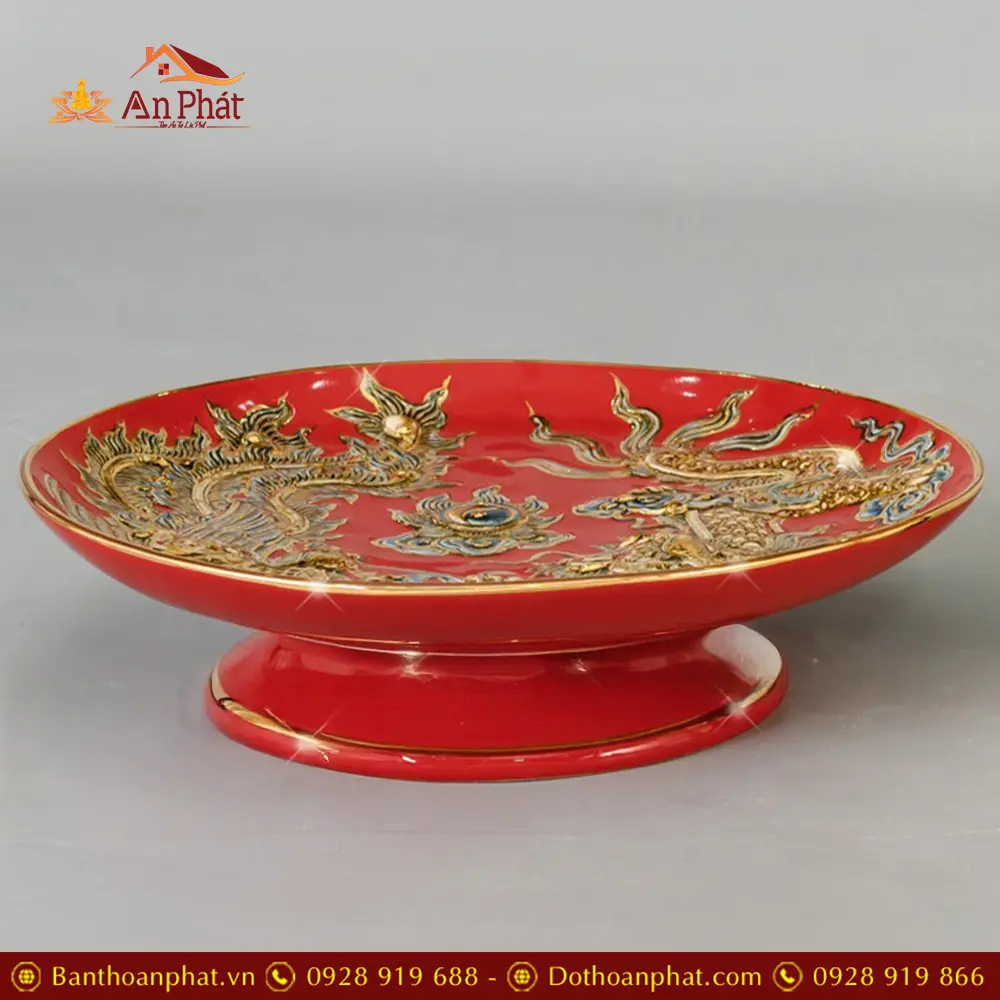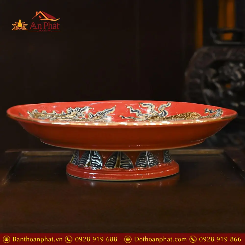 Mâm Bồng Thờ Bát Tràng Đỏ Đắp Nổi Rồng Vẽ Vàng DT694
