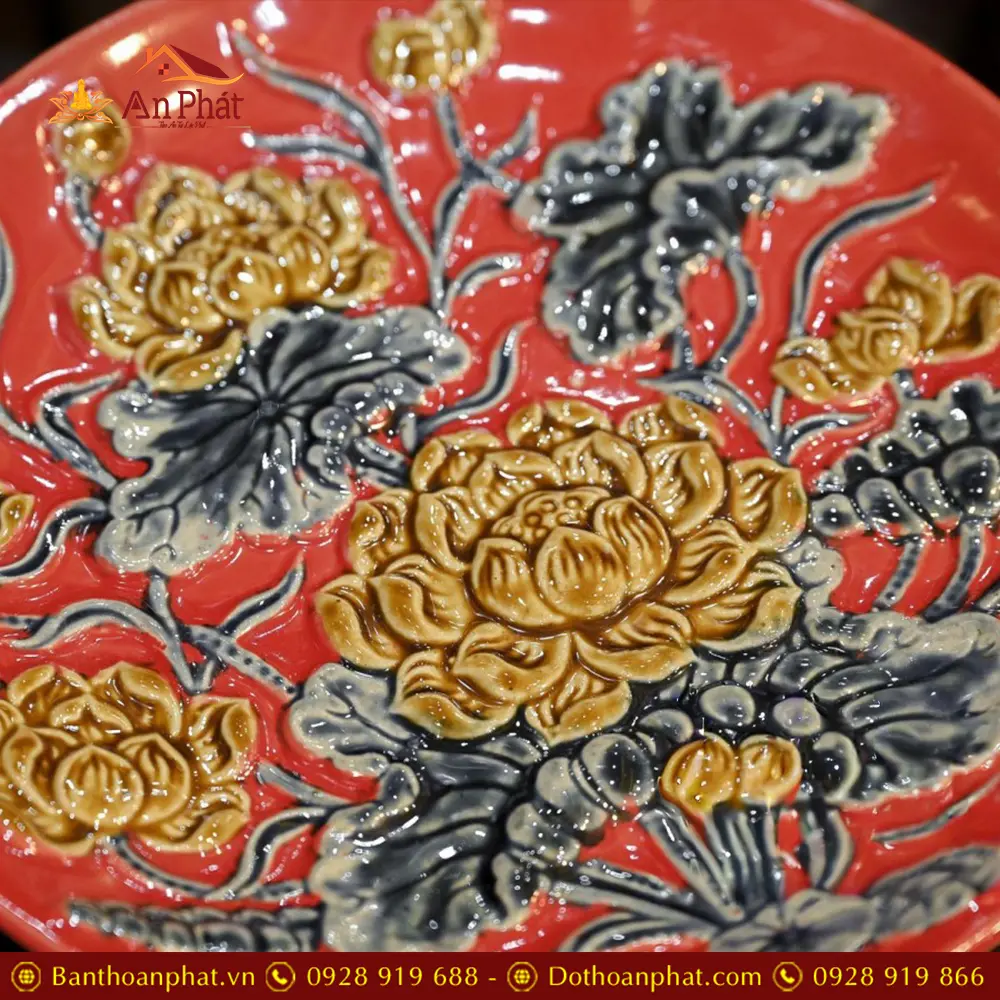 Mâm Bồng Thờ Men Đỏ Đắp Nổi Hoa Sen Gốm Bát Tràng DT702