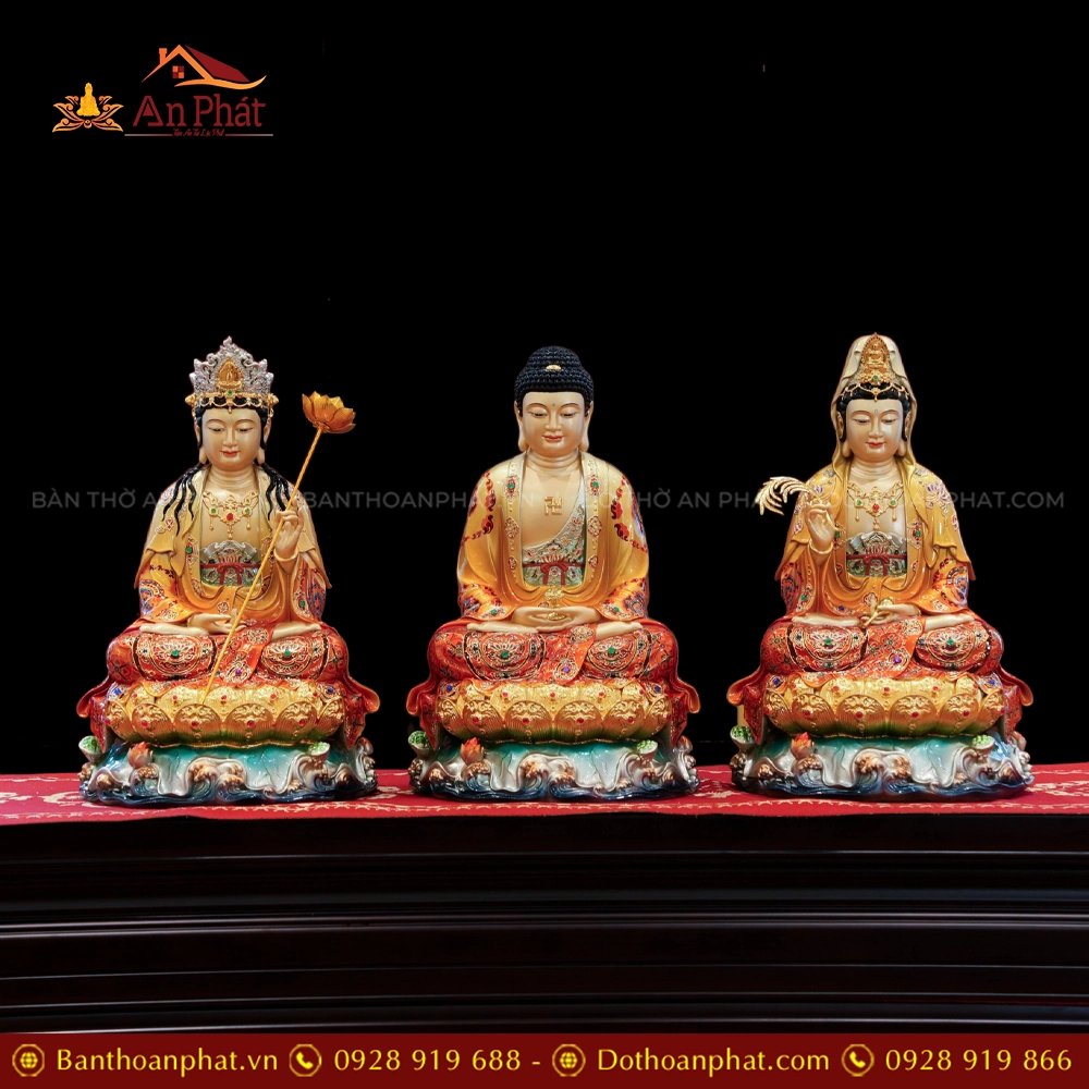 Tôn Tượng Tây Phương Tam Thánh Ngọc Thạch Phủ Đồng Tọa Lá Sen Vẽ gấm Đỏ cam T2394