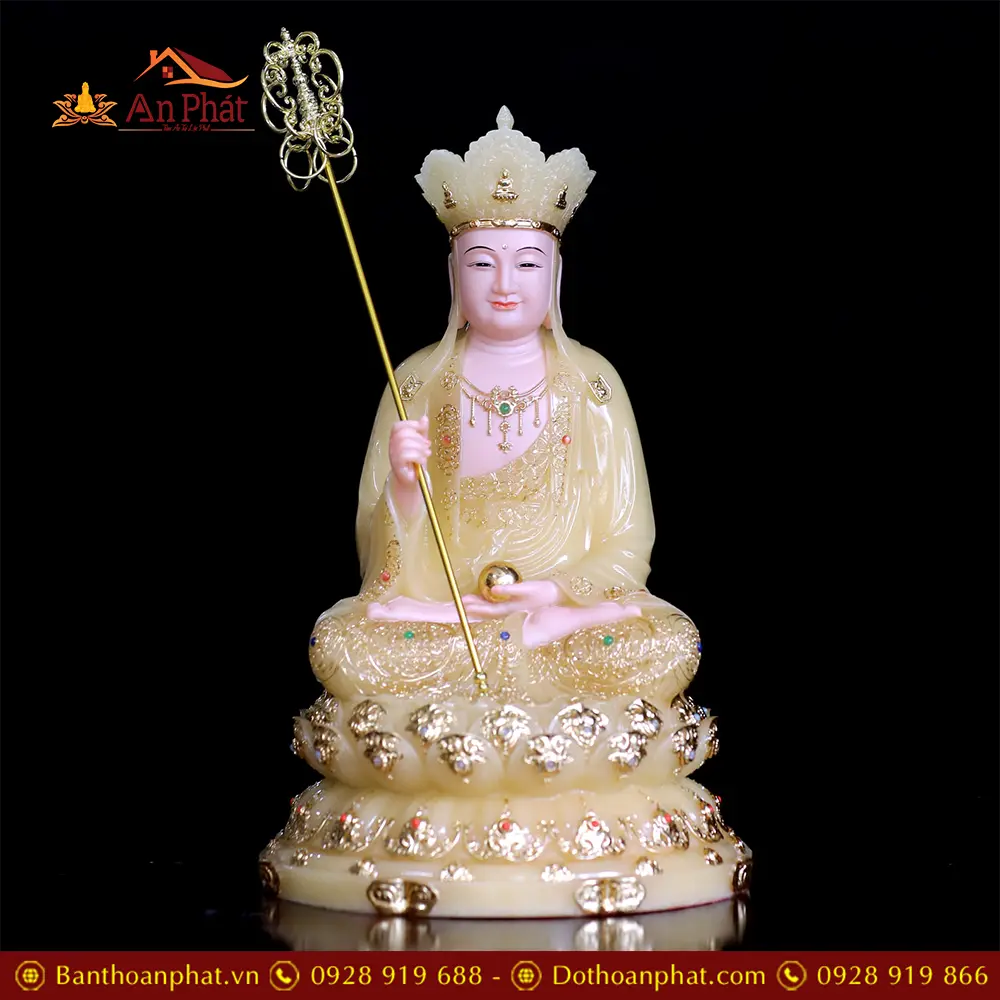 Tượng Địa Tạng Vương Bồ Tát Bột Đá Thạch Anh Viền Vàng Ngồi Đài Sen T2653