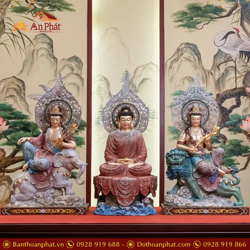Tượng Hoa Nghiêm Tam Thánh Đồng Cao Cấp Y Áo Vẽ Gấm Nhập Khẩu T2714