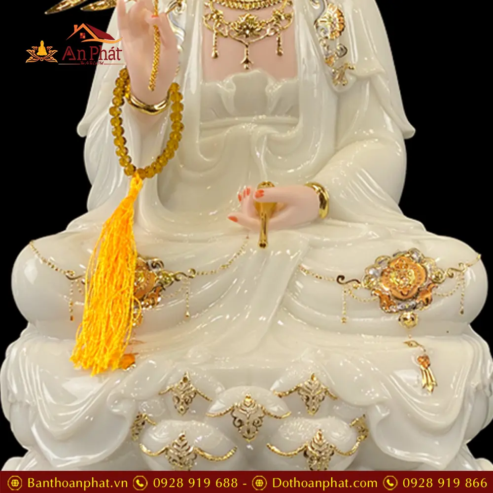 Tượng Quan Thế Âm Bồ Tát Đá Trắng Viền Vàng Ngồi Đế Mây Bằng Bột Đá Cao Cấp T2597
