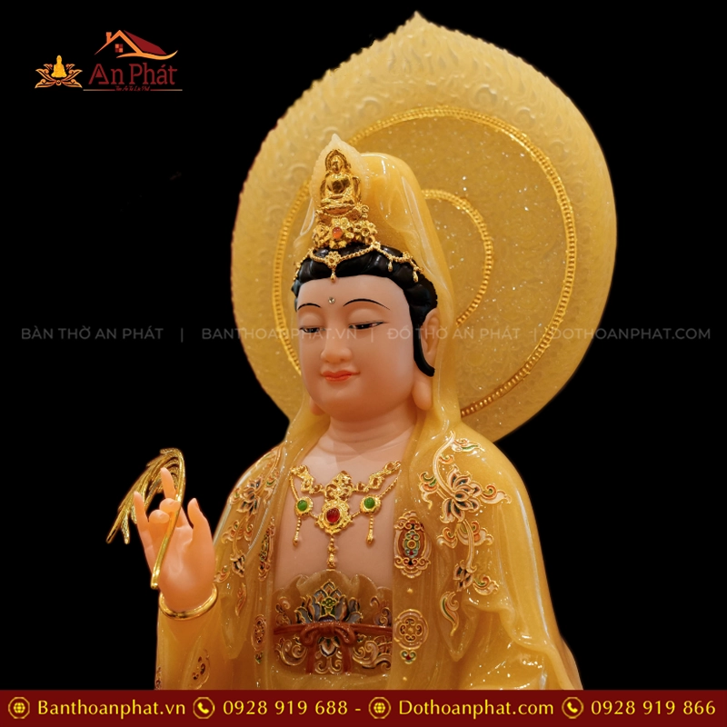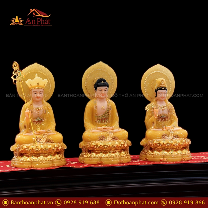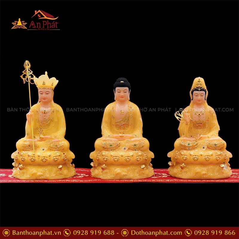 Tượng Ta Bà Tam Thánh Tọa Đài Sen Dát Vàng Ngọc Thạch Có Lá Đề T2381